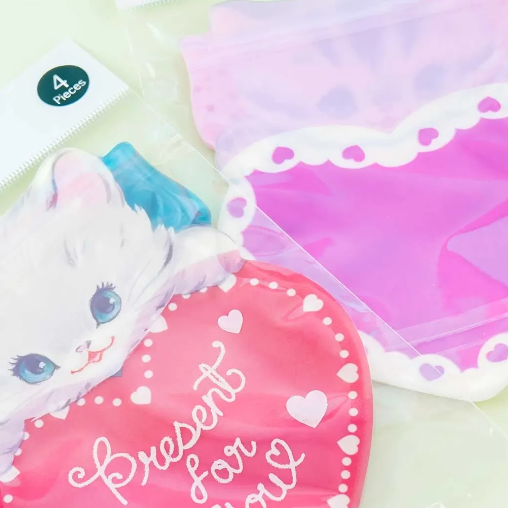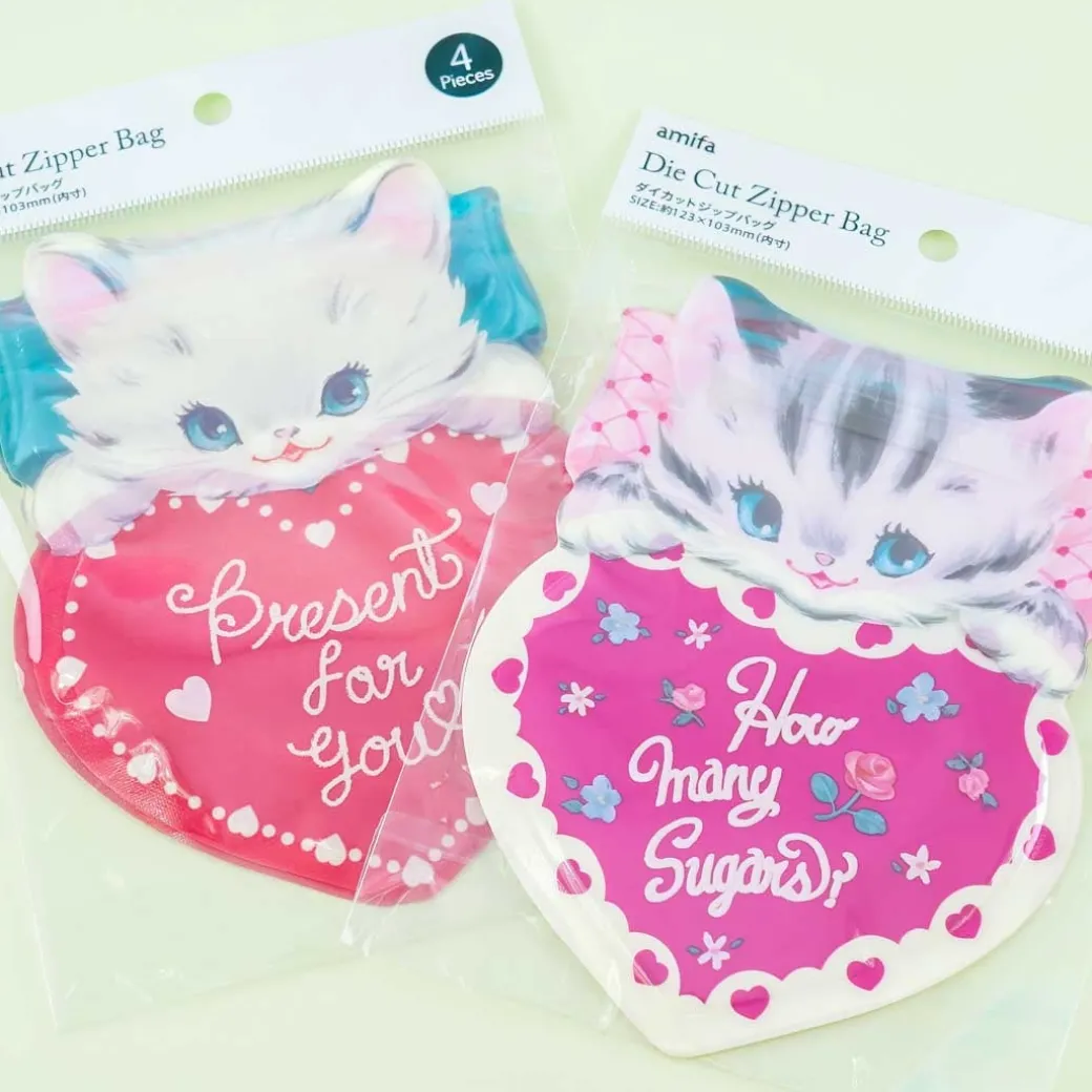 - A cute set of zipper bags illustrated with a cat on top of heart