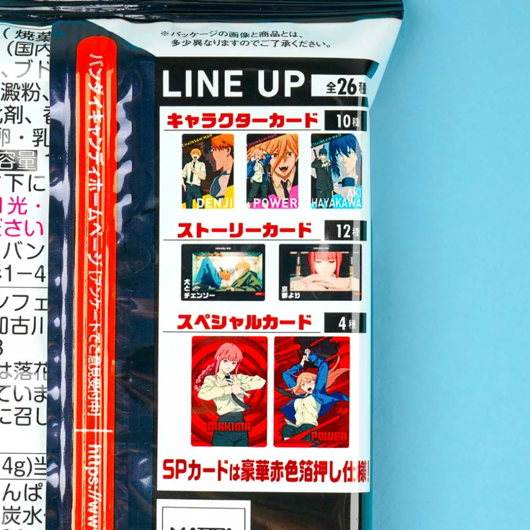 Enjoy munching on this delicious wafer that tastes like vanilla cream! The set also comes with a free collectible card featuring a random character from the popular manga and animated series, “Chainsaw Man.”