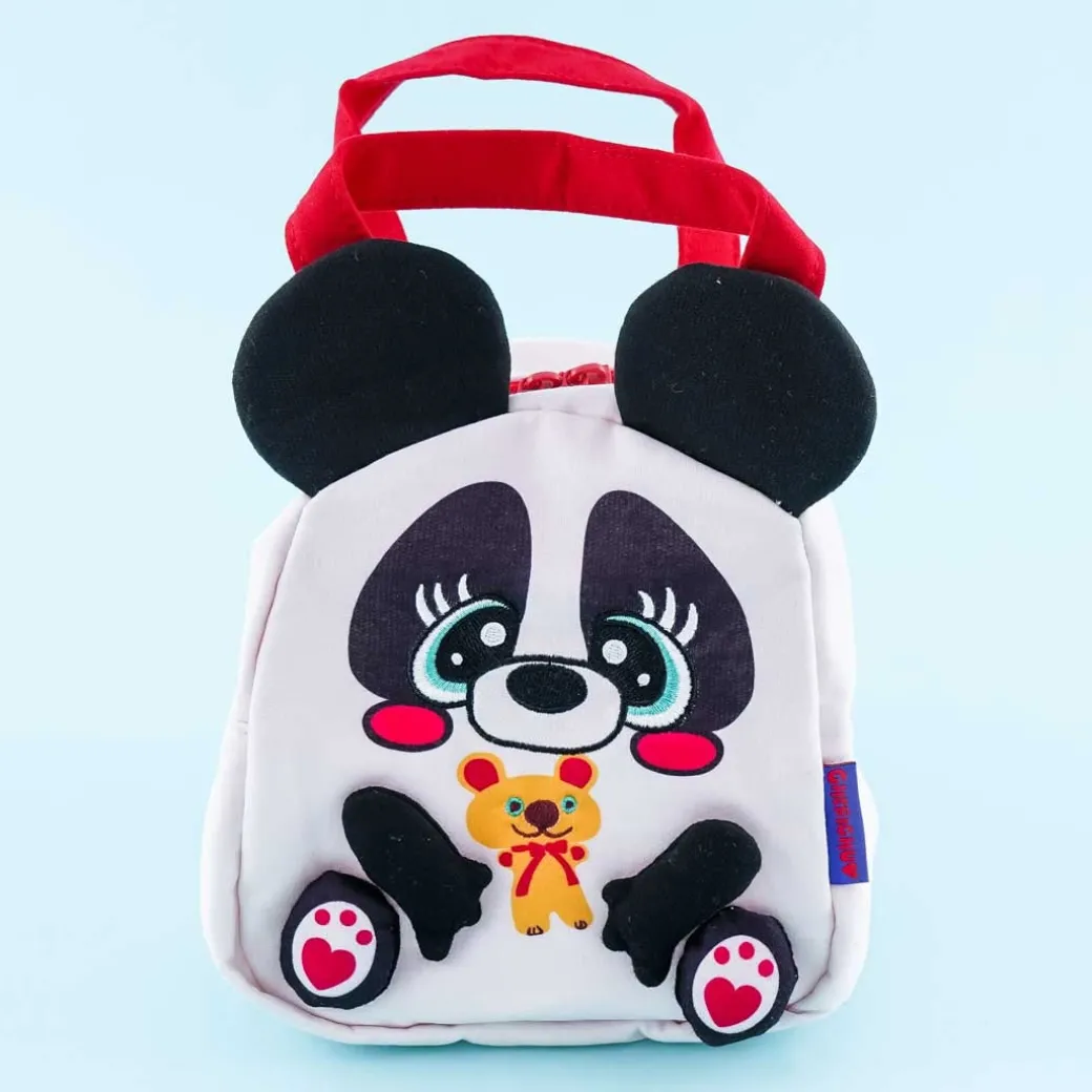 - A cute die-cut lunch tote featuring a baby panda hugging a bear
