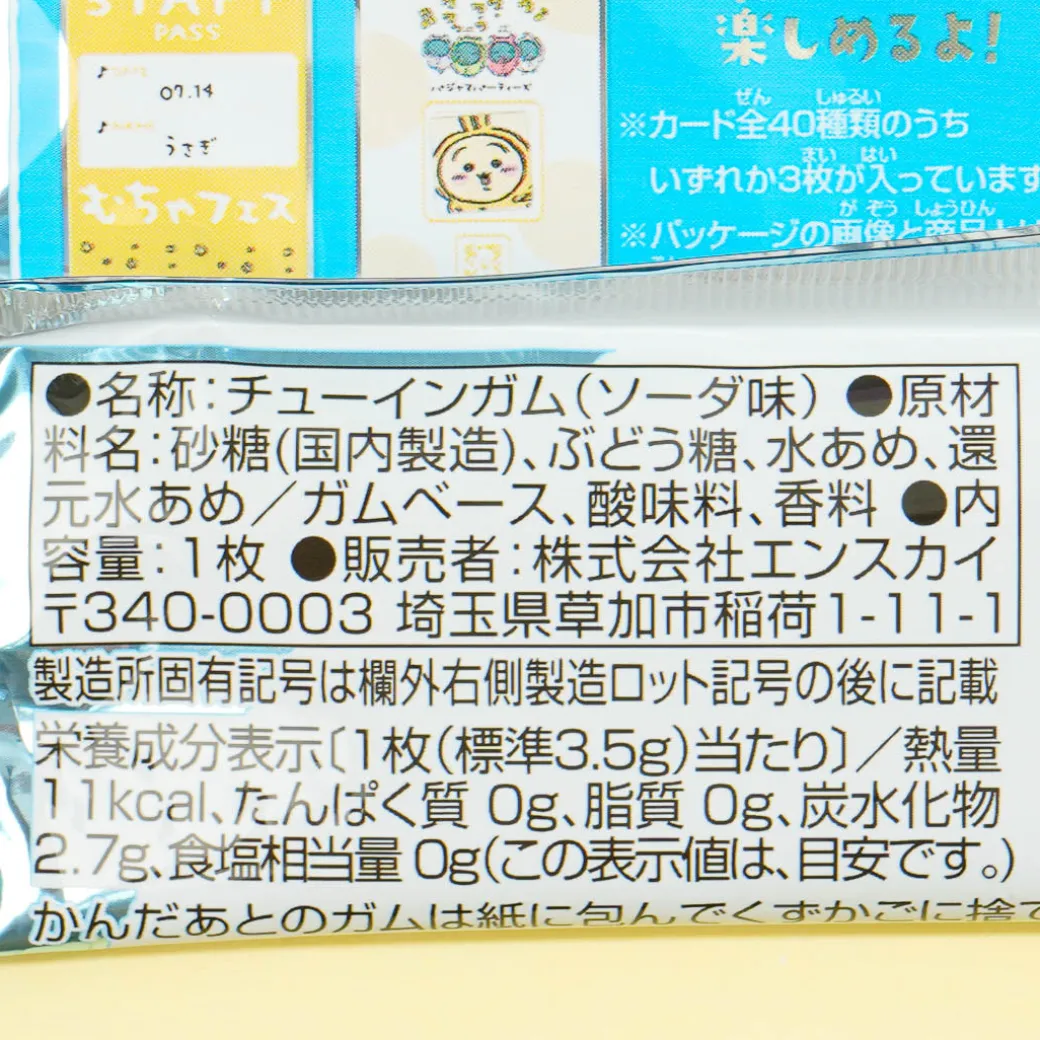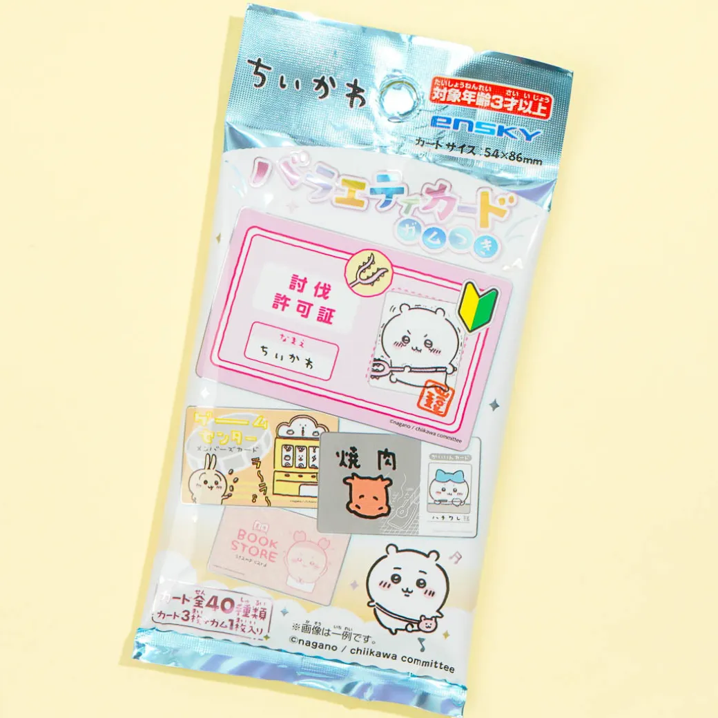 Make space in your kawaii haul for this cute collectible card set. It features prints of Chiikawa characters! This card pack comes with a stick of soda-flavored gum. Surprise yourself with random cards from a set of 40 different designs.