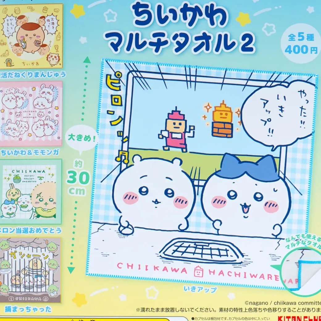 Wipe off your sweat using this cute mini towel! It features illustrations of different scenes from the Chiikawa anime series. The towel comes in a gachapon capsule so you’ll get a surprise design!