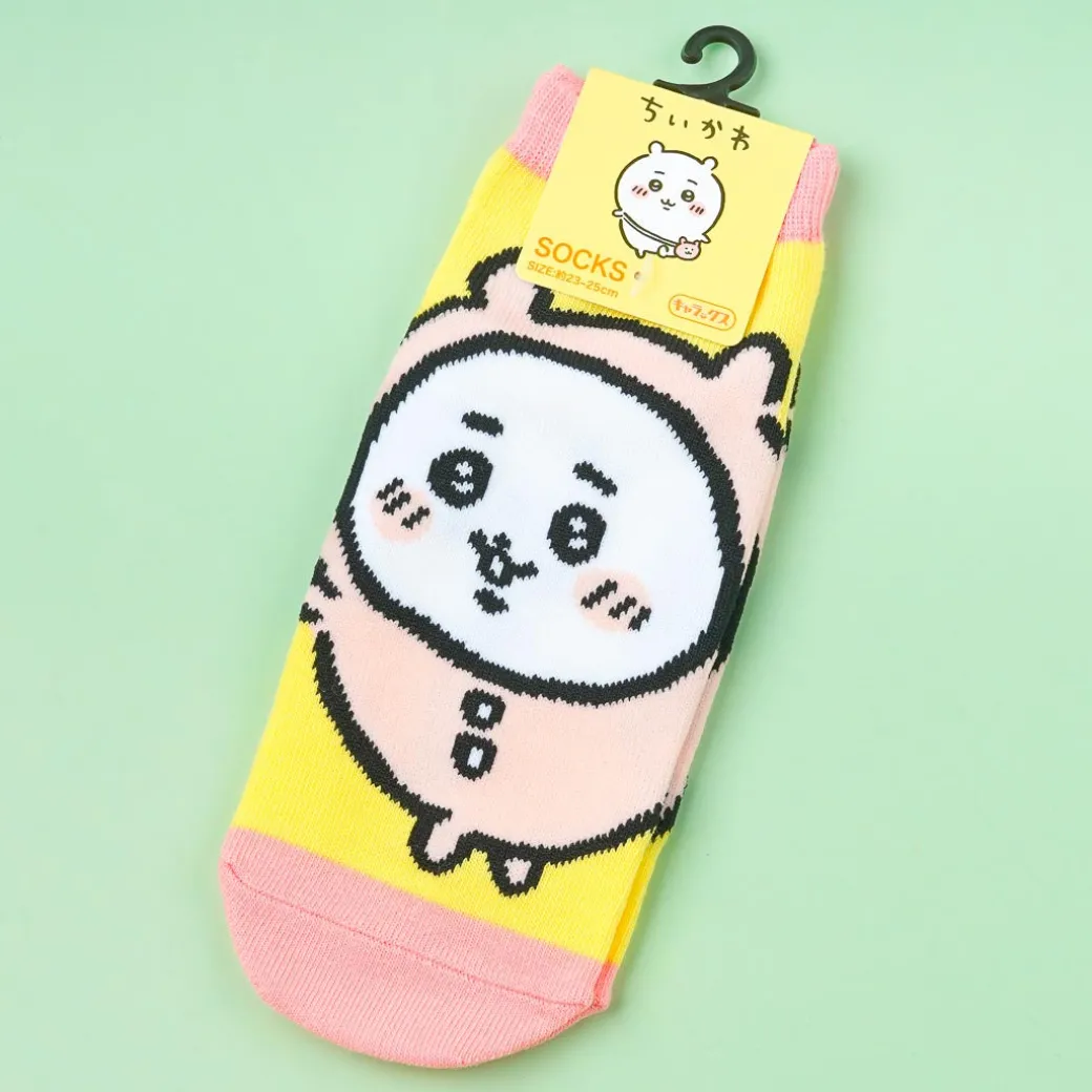 Keep your feet warm and comfy with these cute socks! The ankle-length pair features a blushing Chiikawa in a pink pajama.