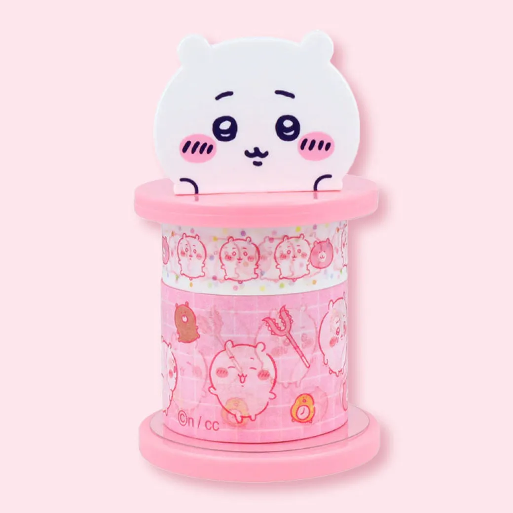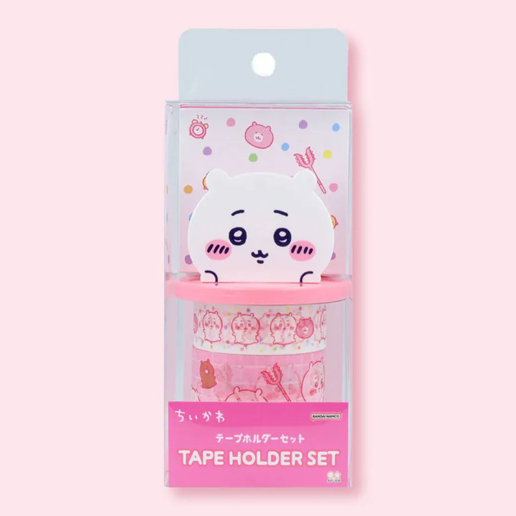 Make crafting and journaling more fun using this super cute tape holder set! It includes a tape holder and two rolls of washi tape featuring prints of Chiikawa. The holder keeps your tapes organized and easy to use while adding a kawaii touch to your desk!
