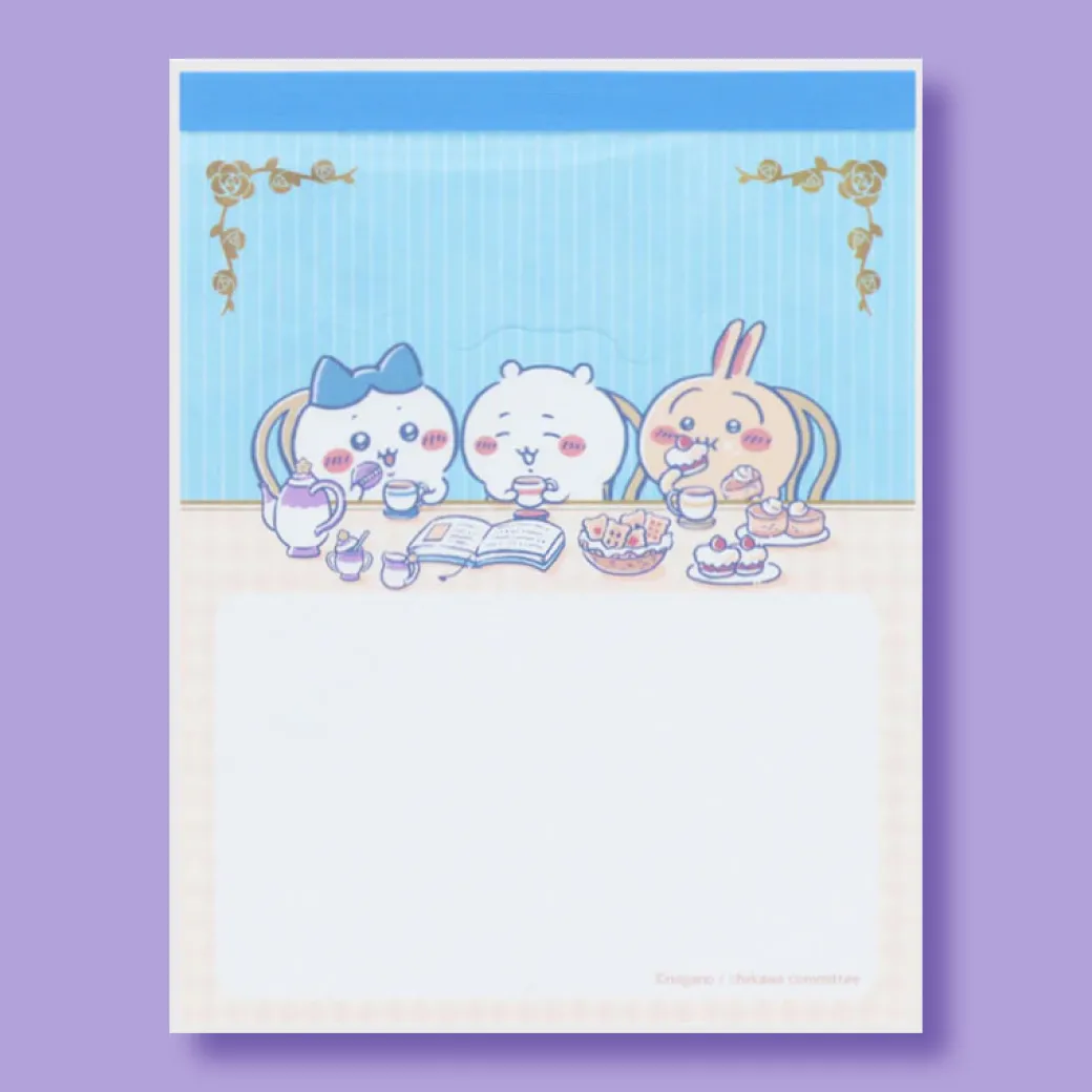 Write quick notes with this mini notepad! It showcases a print of Chiikawa characters enjoying tea time. This memo pad also stands upright so you can easily see it on your desk!