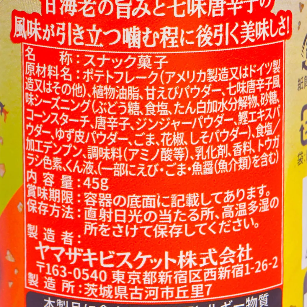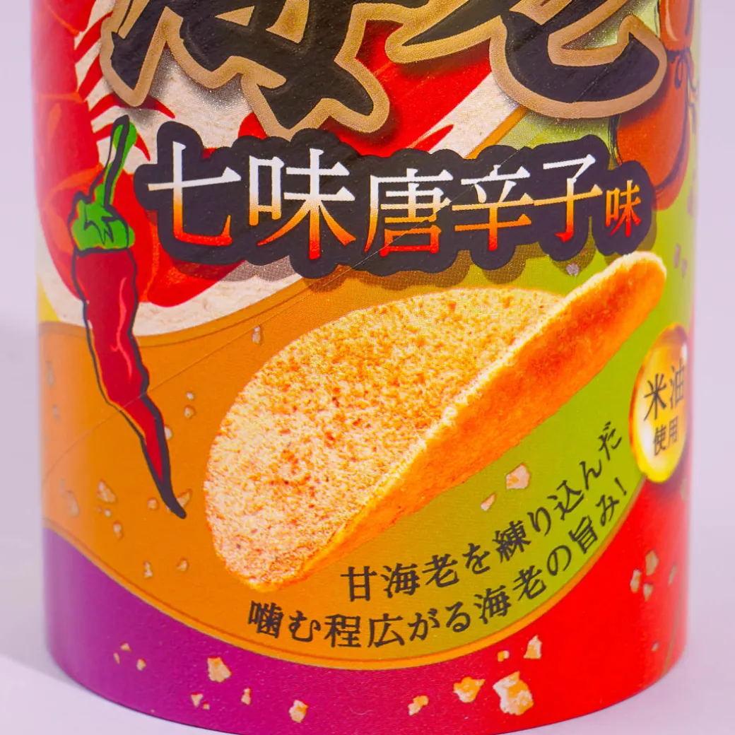 Share this tube of premium potato chips during special movie nights with friends! It combines the taste of sweet shrimp and the taste of schichimi peppers from Japan. Enjoy the spicy and savory taste of these potato chips.