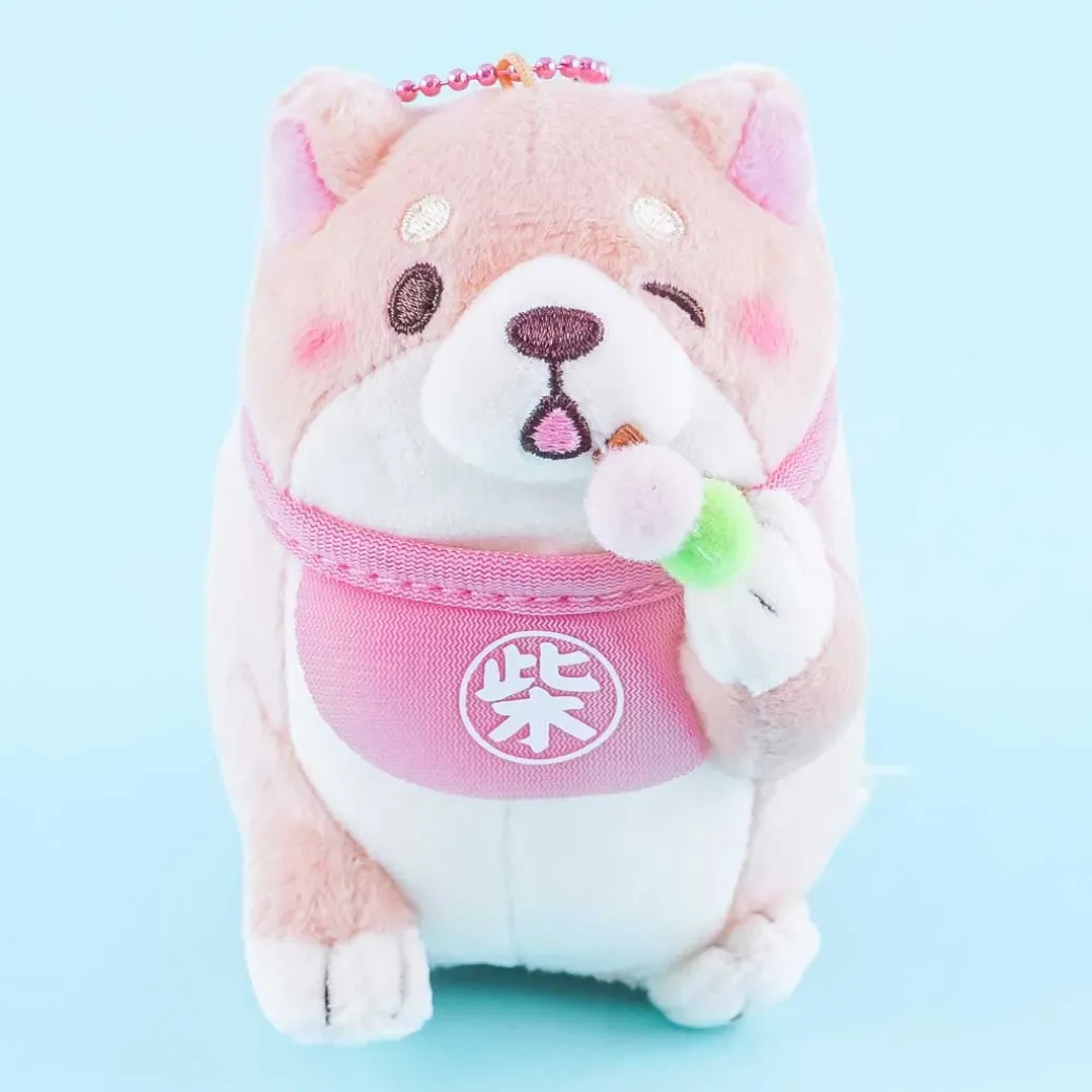 - A cute medium-sized Sakura plushie from the Chuken Mochi Shiba series eating some dango