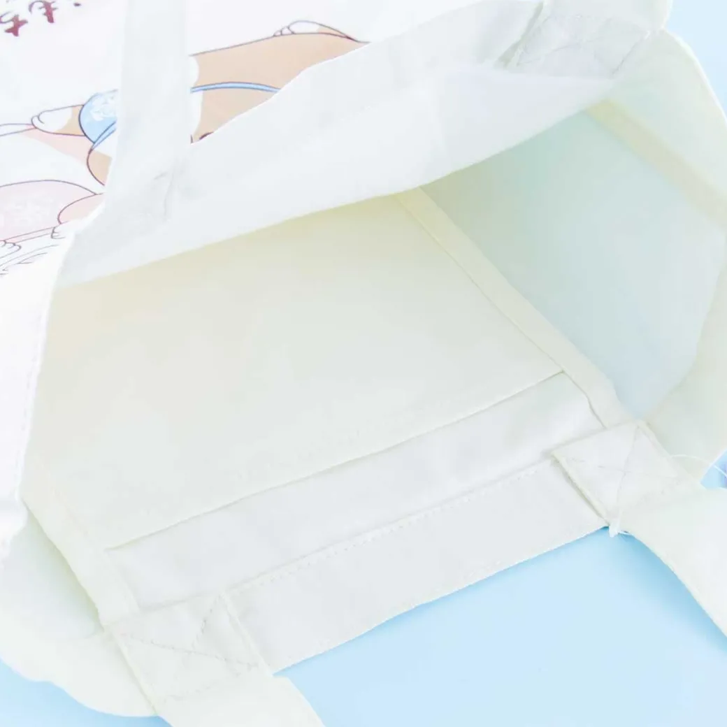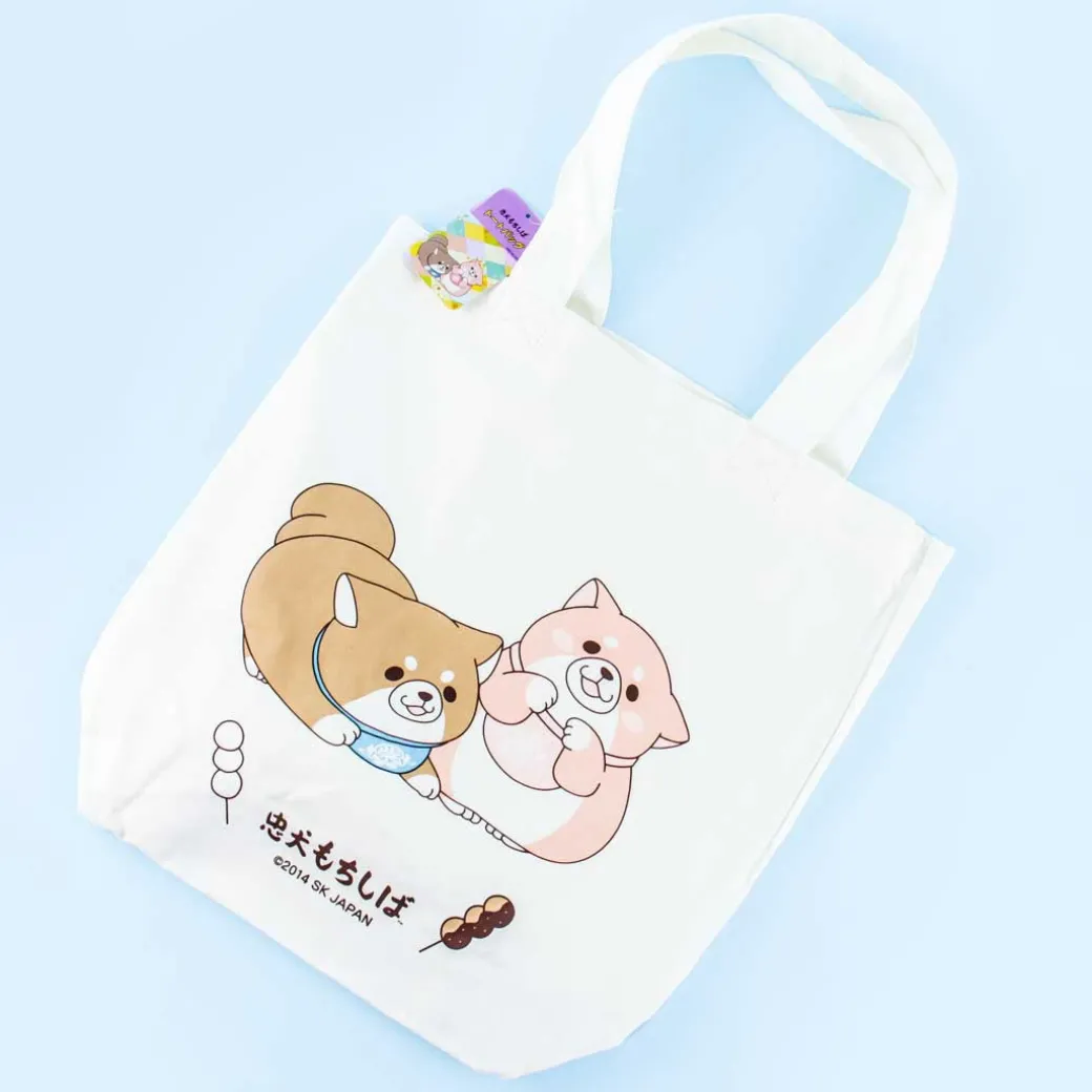 - A kawaii canvas tote bag featuring Chuken Mochi Shiba characters and dango balls on stick
