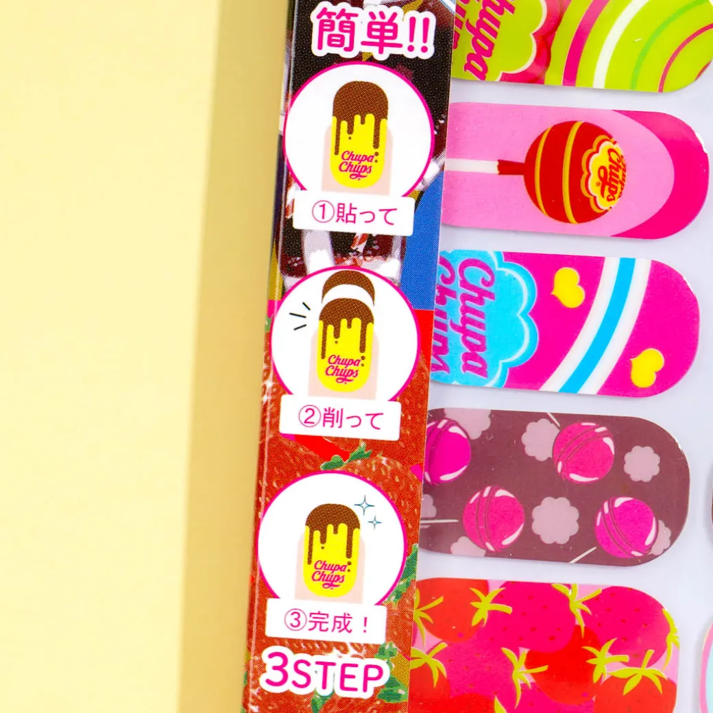 Kawaii-fy your nails with this super cute set of acrylic stickers. They’re designed to look like the colorful packaging of Chupa Chups lollipops!