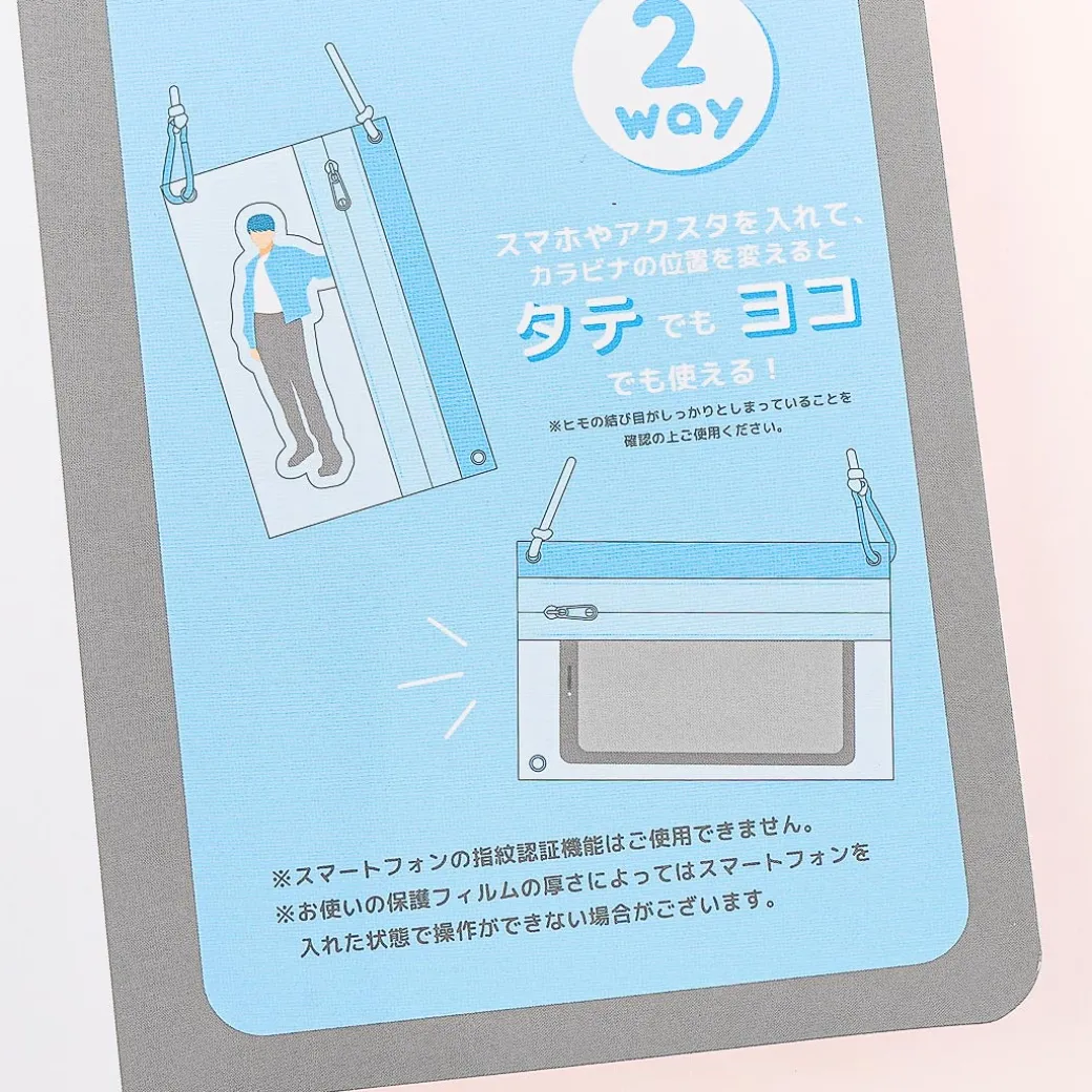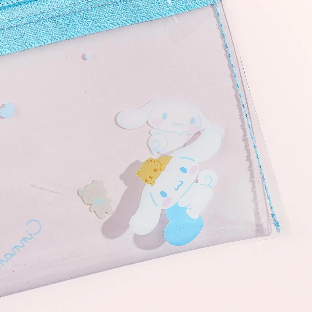 This transparent flat pouch has mini illustrations of Cinnamoroll all over! Use this to keep your smartphone and cash on hand while running errands. It comes with a detachable long string that has a metal carabiner which you can adjust so you can carry the zippered pouch vertically or horizontally — hands-free!
