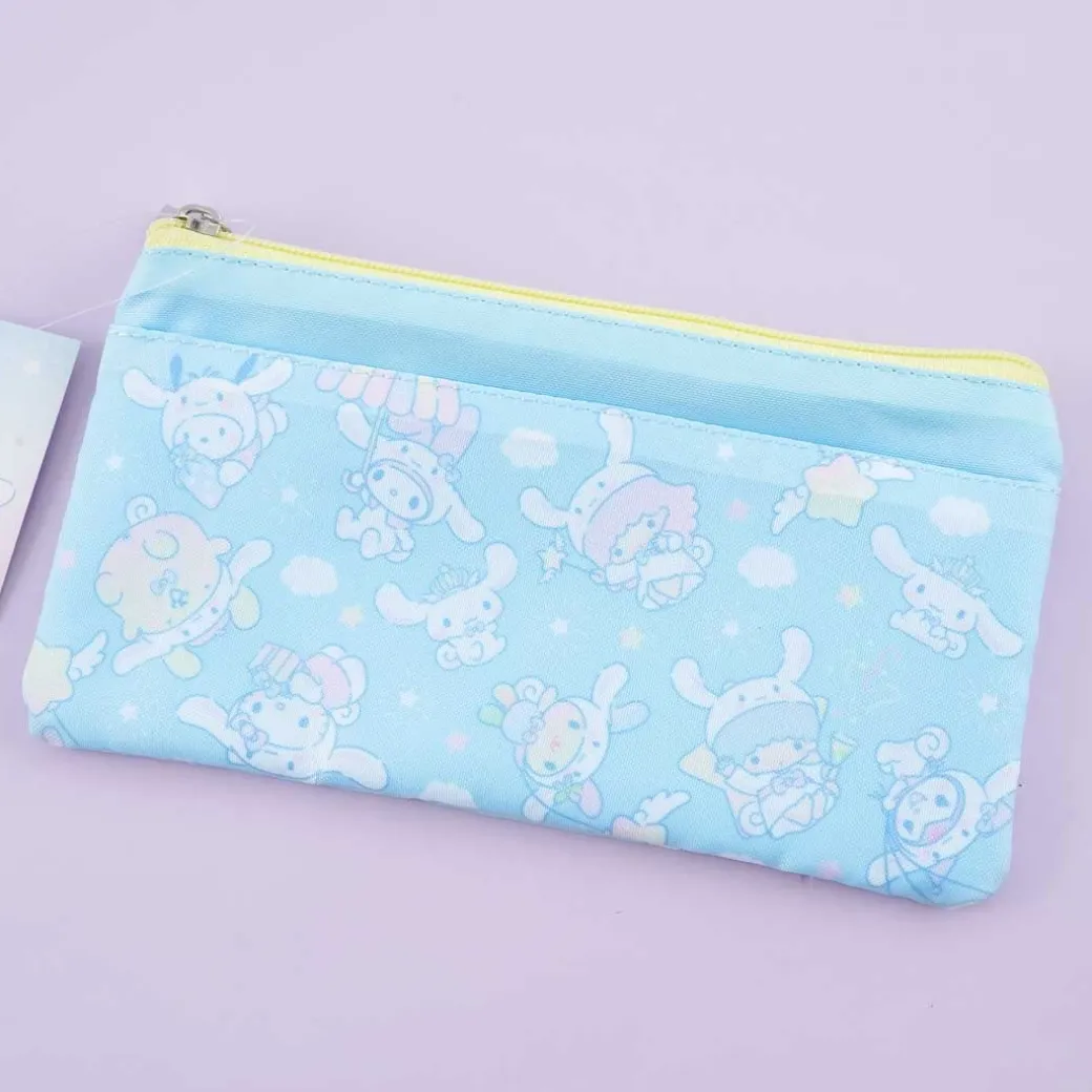 - A kawaii blue-colored mask pouch with illustrations of Sanrio Characters all dressed in Cinnamoroll onesies
