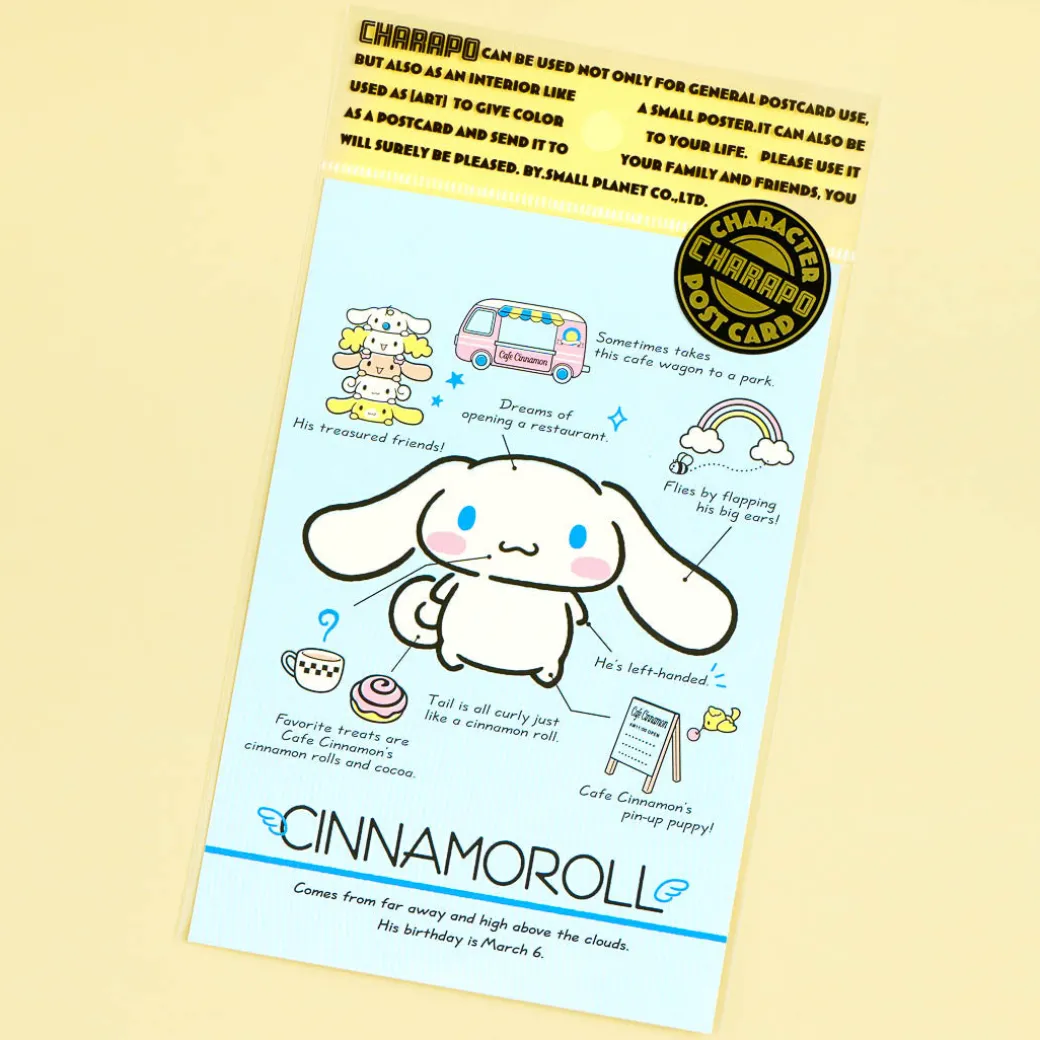 Share fun facts about Cinnamoroll with your buddies with this kawaii postcard! It features a cute illustration with information about Cinnamoroll.