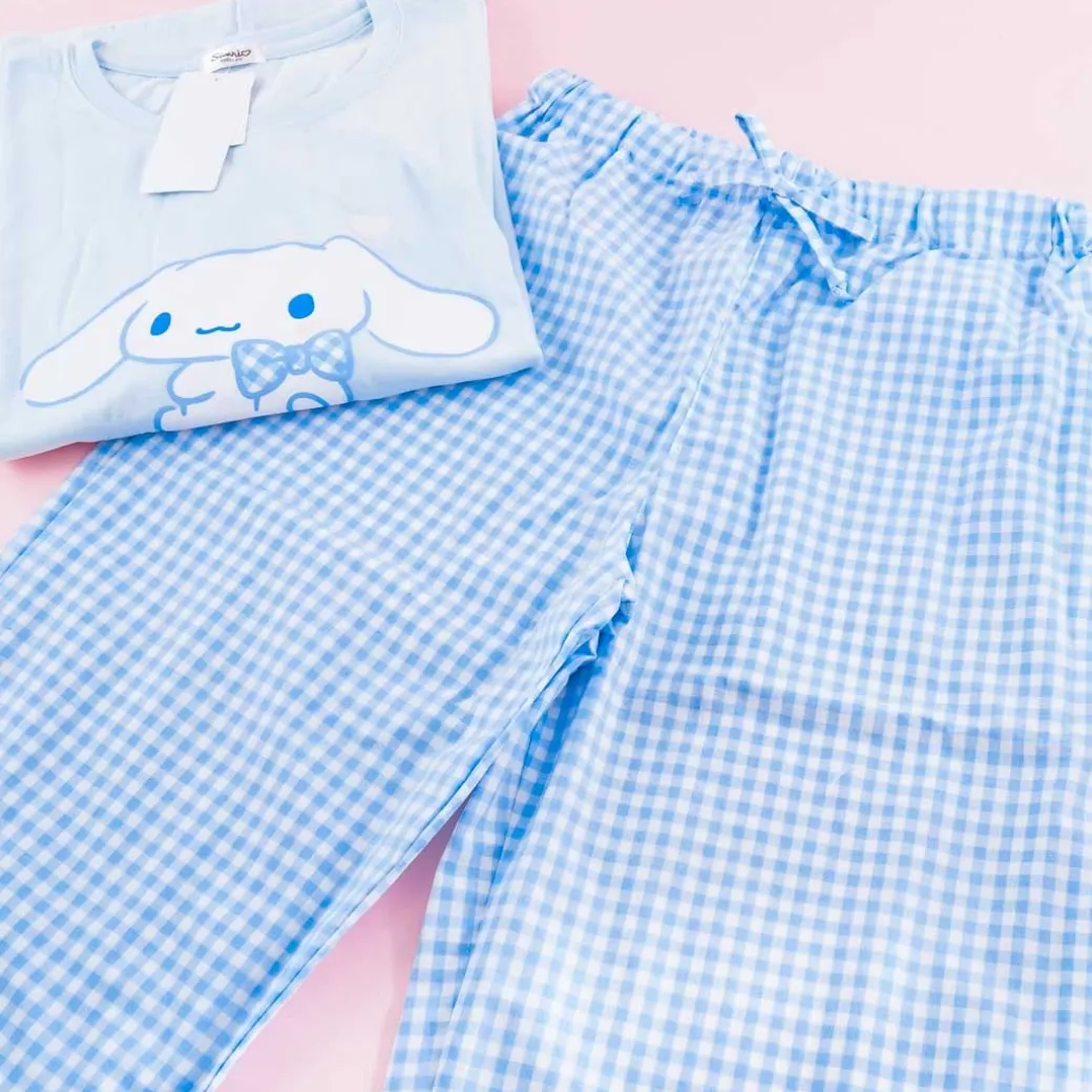 - A kawaii pajama set with a loose shirt illustrated with a print of Cinnamoroll