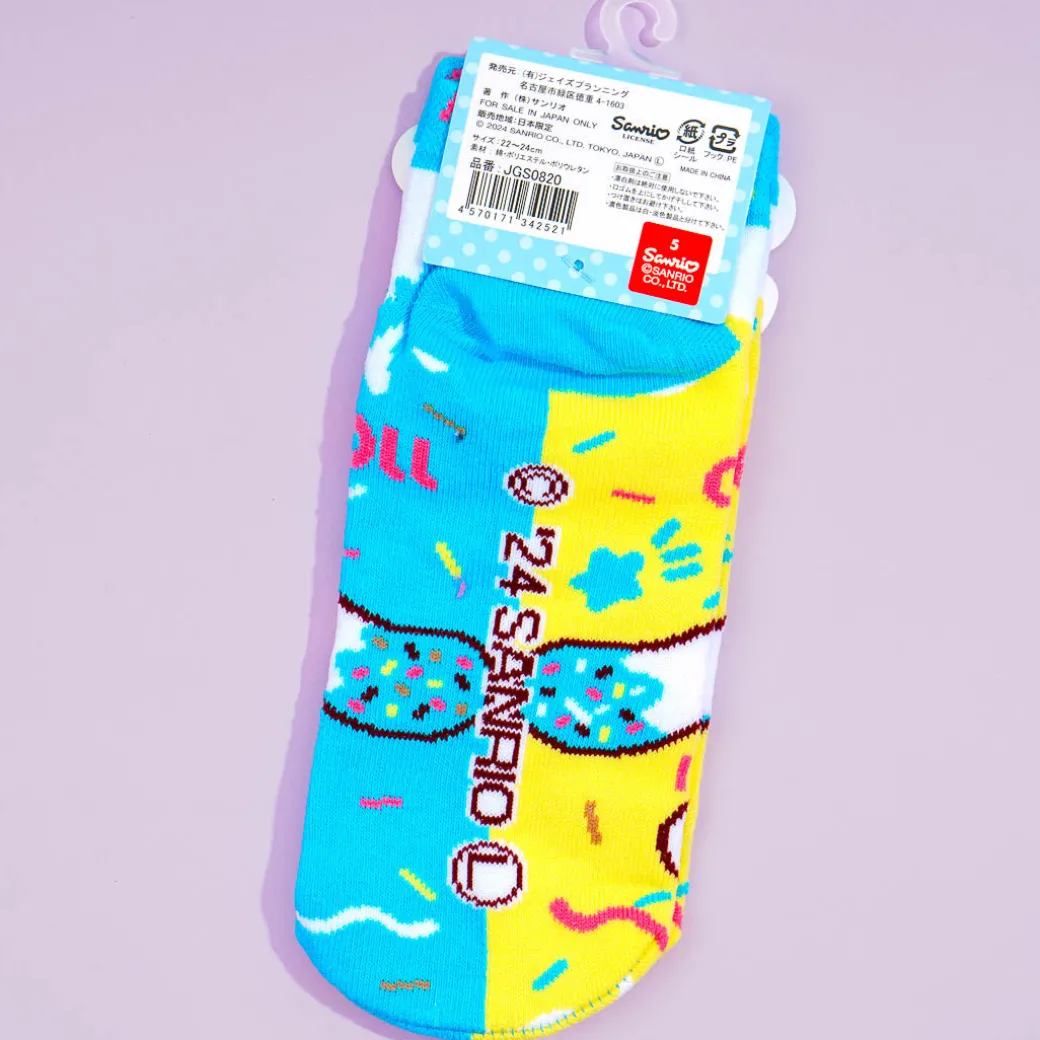 Put on this pair of super kawaii socks before wearing your shoes! It’s illustrated with Cinnamoroll wearing a dapper outfit while holding up a yummy donut.