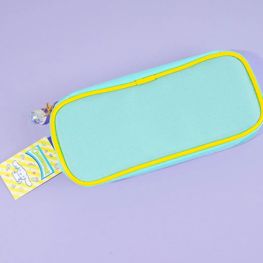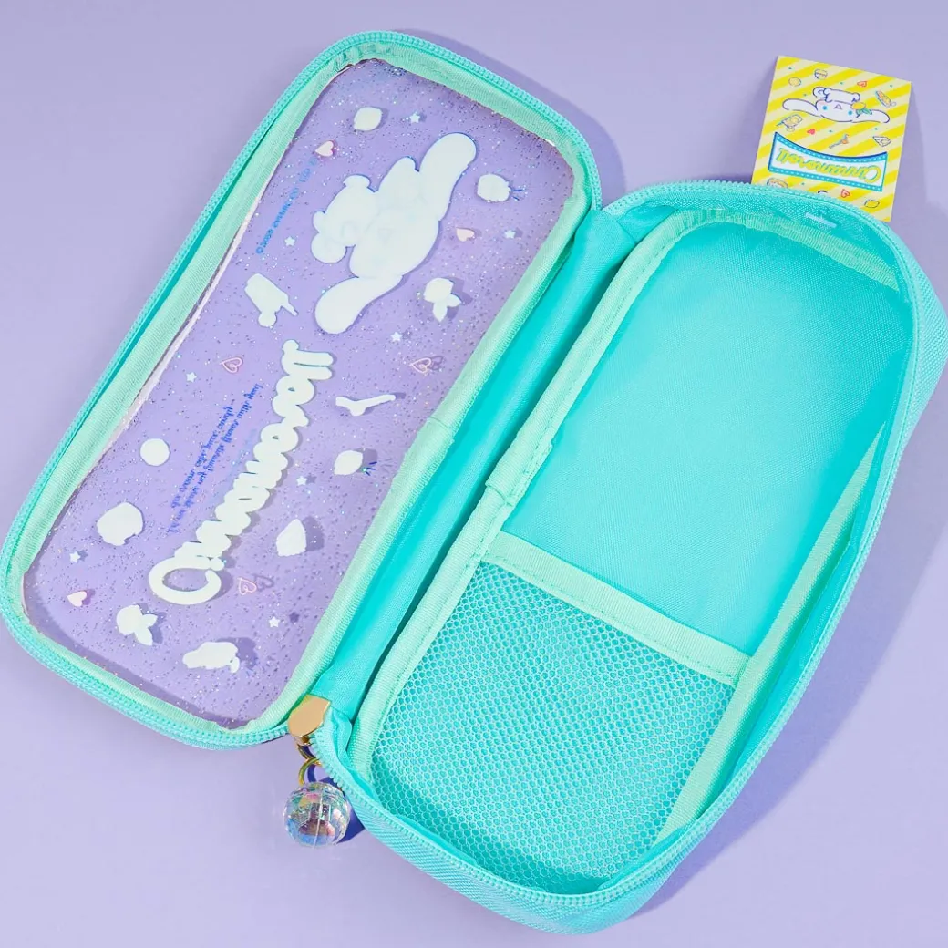 Use this kawaii pen case to store your pencils, highlighters, and other writing tools. It has a clear front side illustrated with Cinnamoroll surrounded by tasty treats! This pen case also has a zipper closure with a crystal charm to keep your things safe and secure,