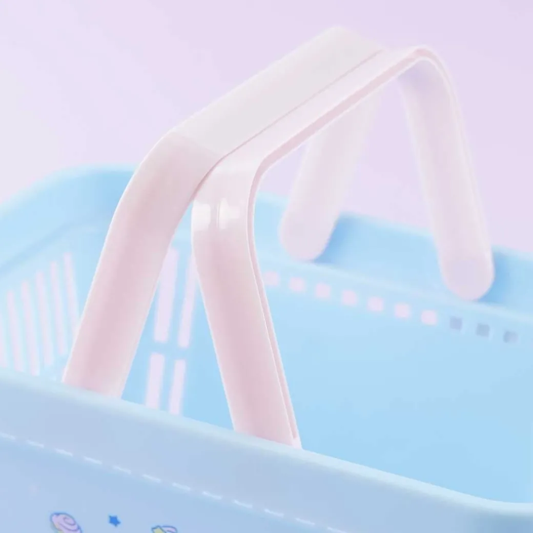 - A mini shopping basket featuring prints of Cinnamoroll, stars, clouds, and sweets