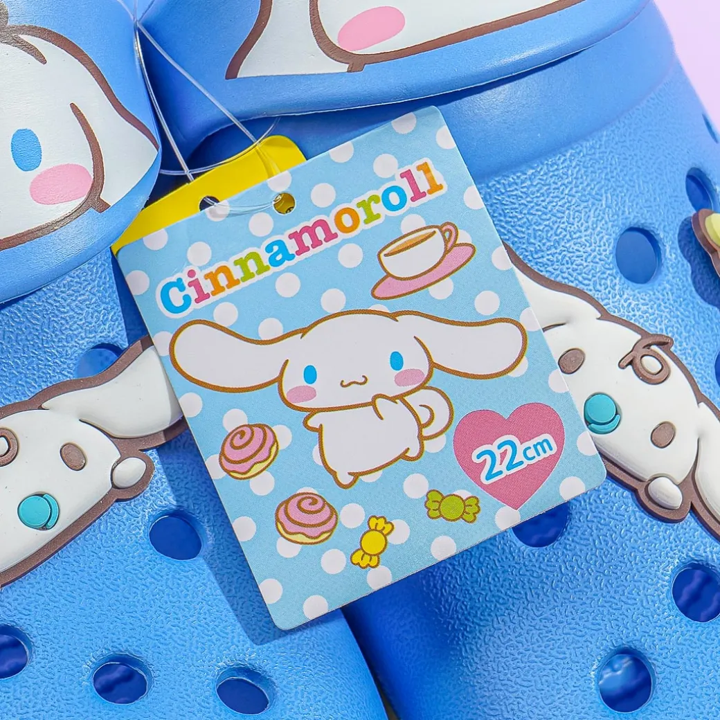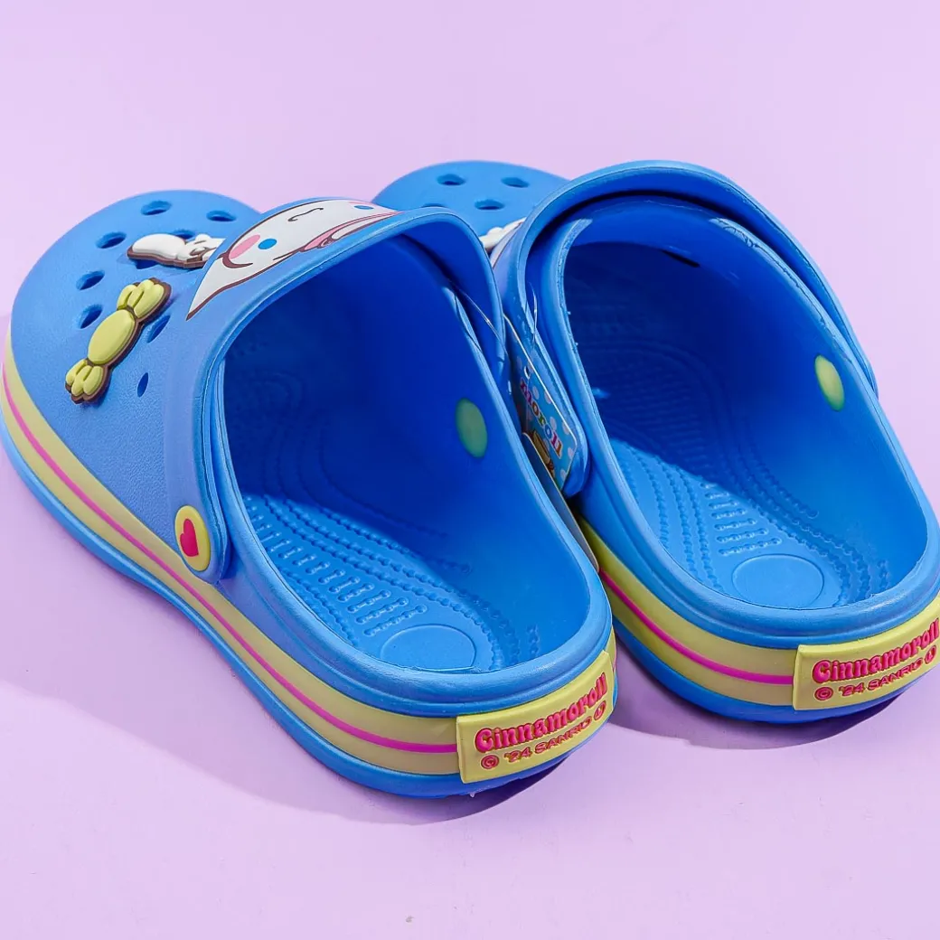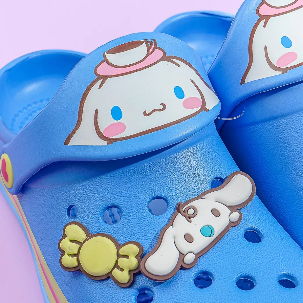 Take a walk outside while wearing this comfy pair of sandals! These small-sized slippers have kawaii illustrations of Cinnamoroll and rubber charms of Milk and sweets! The blue slip-ons are made from EVA — a rubber-like resin material.