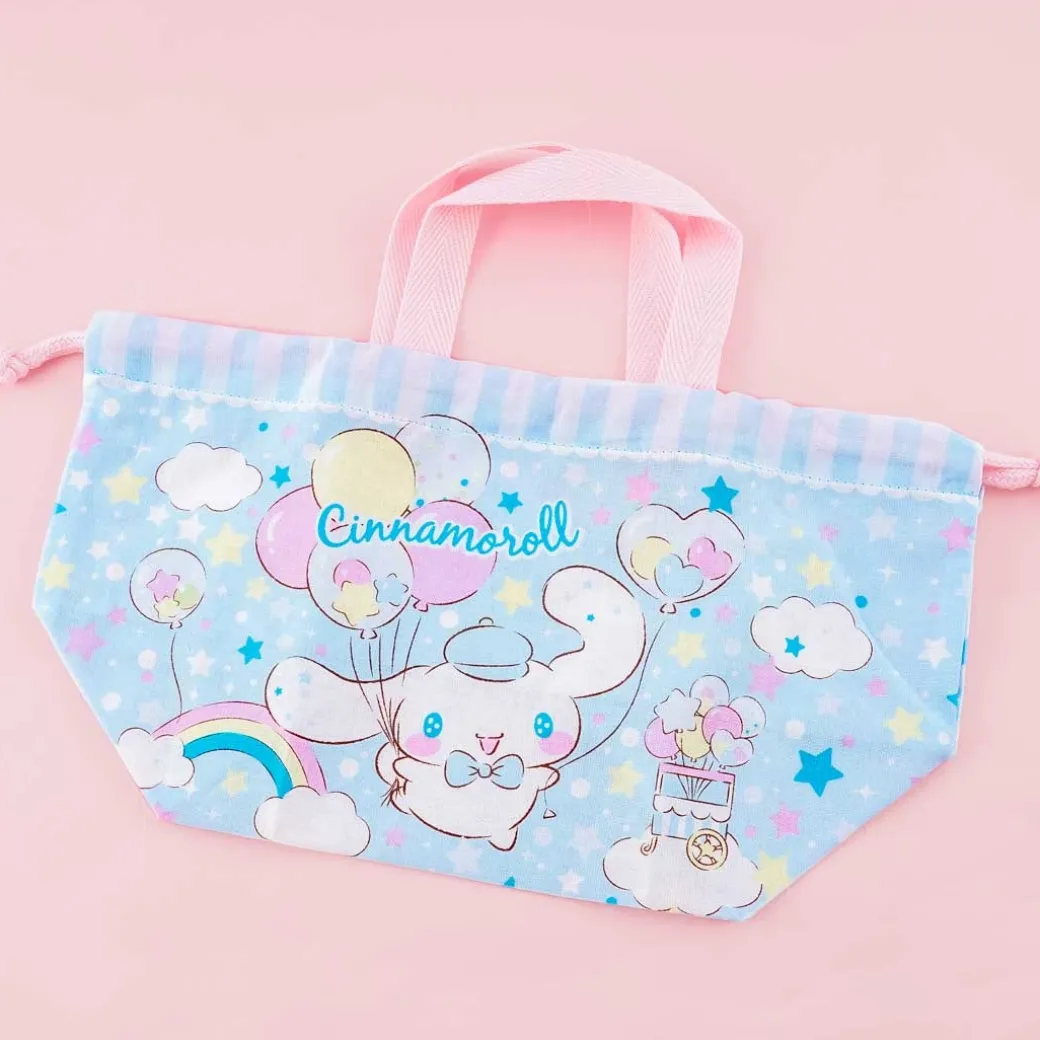 - A cute cotton drawstring pouch showcasing prints of Cinnamoroll and balloons