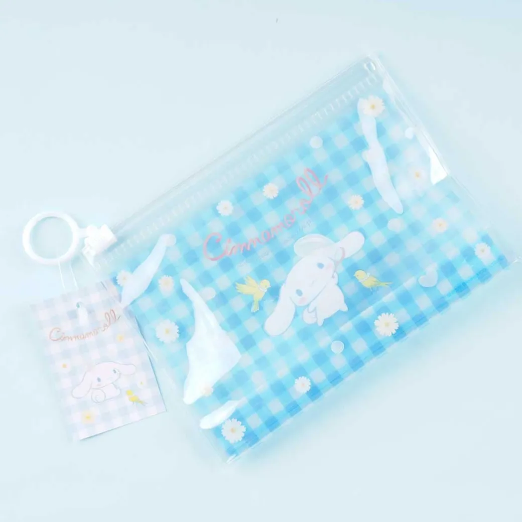 - A cute transparent slider pouch illustrated with Cinnamoroll surrounded by flowers