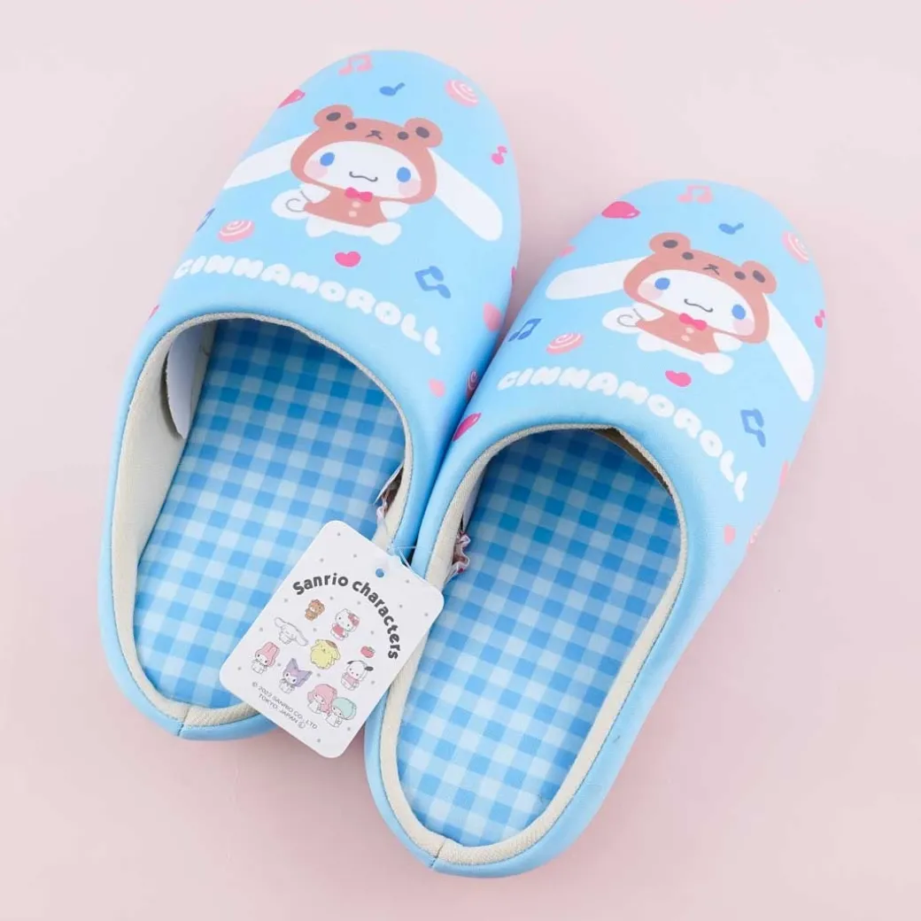 - A super cute pair of slippers decorated with Cinnamoroll wearing a bear outfit