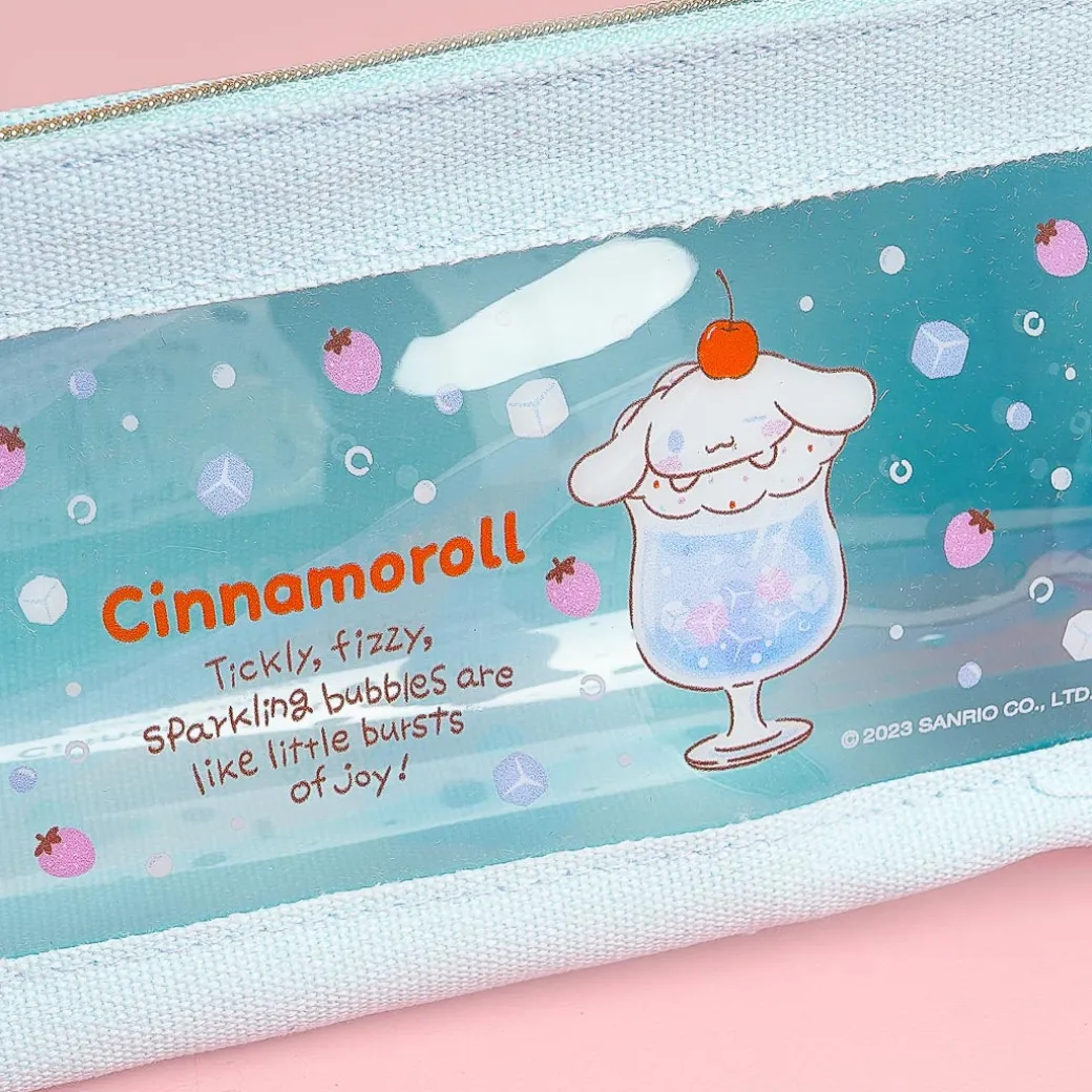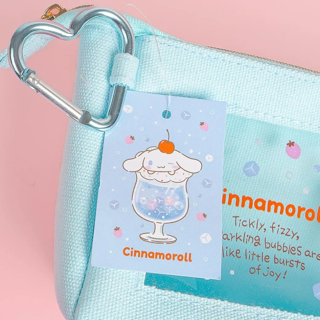 This super kawaii pouch with a clear window design is perfect for keeping your cosmetics! It’s made from canvas material and features cute prints of Cinnamoroll in a glass of fruity soda. This pouch also comes with a heart-shape metal carabiner where you can attach cute charms.