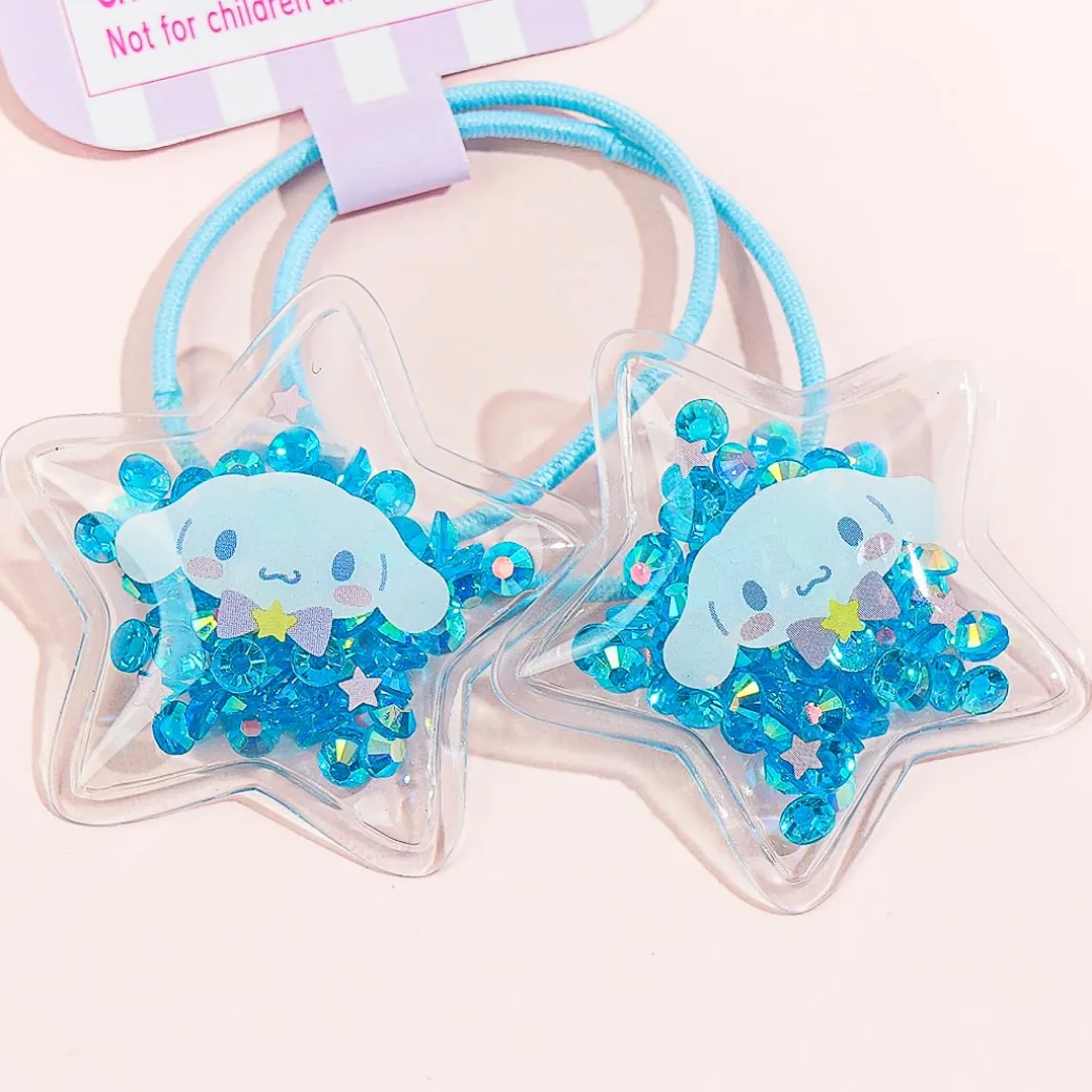Give yourself a kawaii hairdo with this super cute set of hair ties. Each one has a cute star-shaped charm illustrated with Cinnamoroll! These charms have glitter inside.