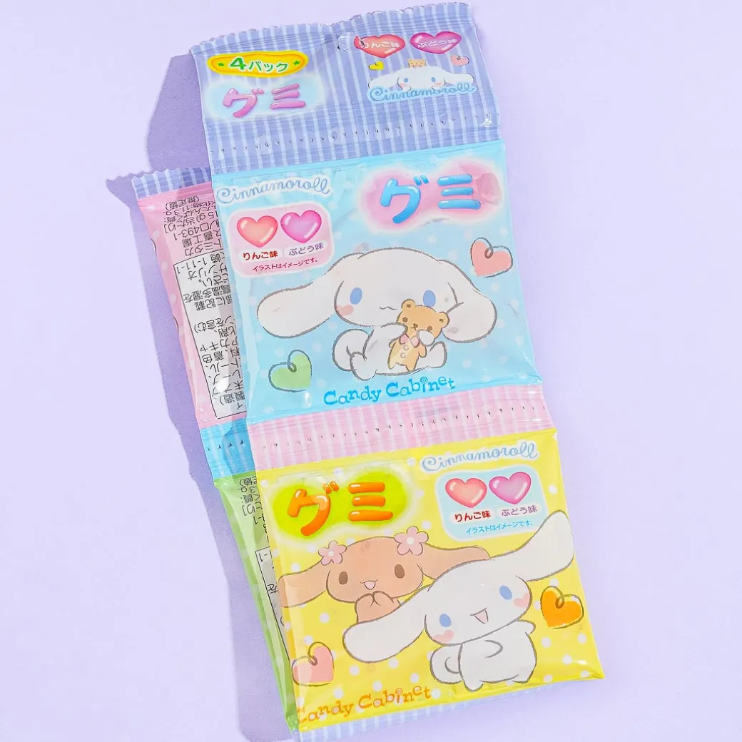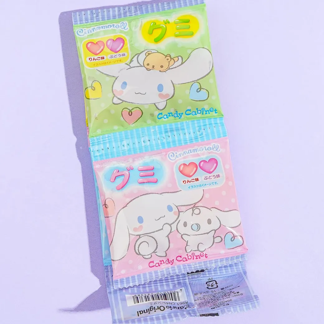 Enjoy these packs of heart-shaped gummy candies with your friends! They feature apple and grape flavors and come in cute packaging illustrated with Cinnamoroll and his buddies.