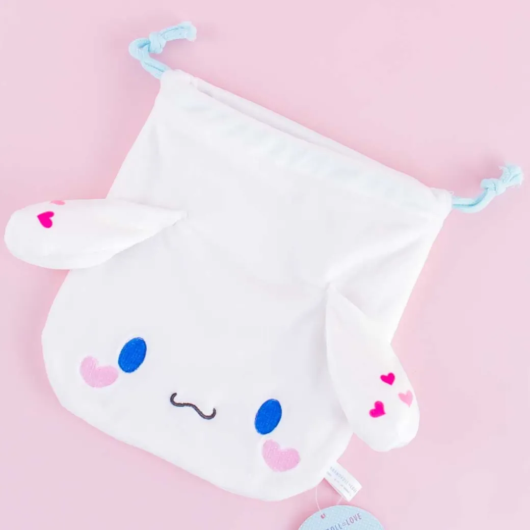 - A Cinnamoroll drawstring bag with hearts and pop-out ears