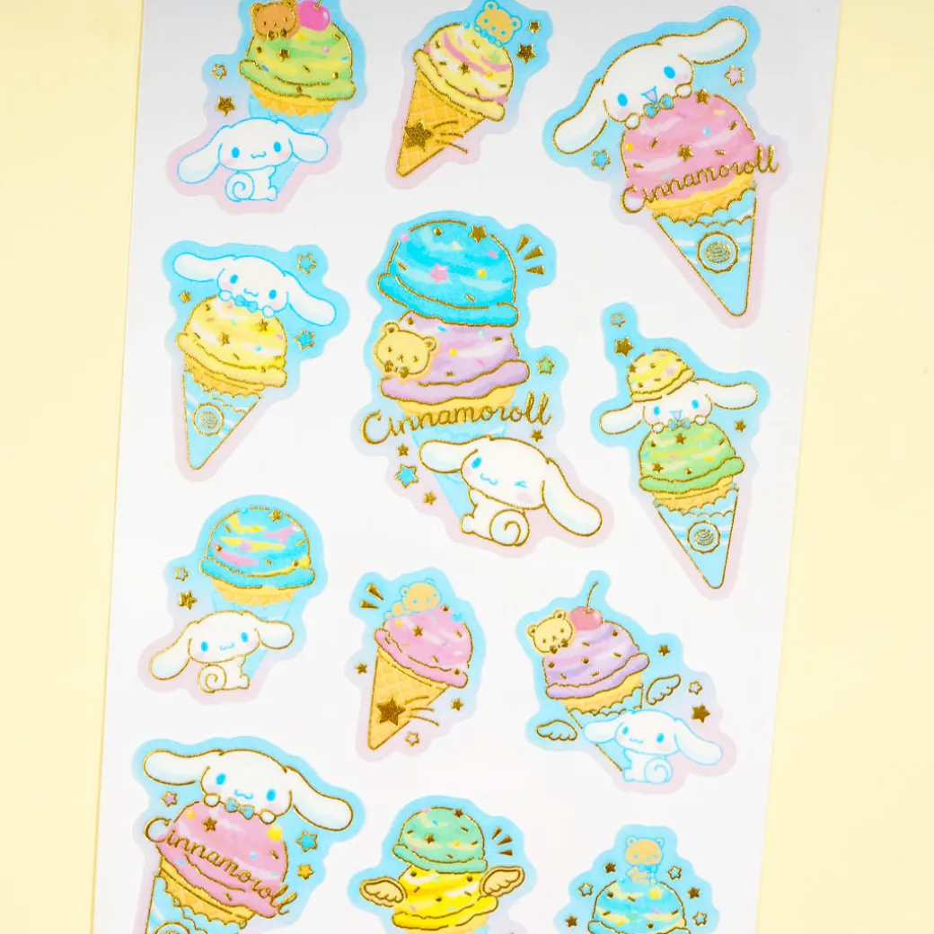 Add a dose of cuteness to your notebook by using these super kawaii stickers! They feature die-cut prints of Cinnamoroll and yummy-looking ice cream. Each sticker has gold foil stamping!