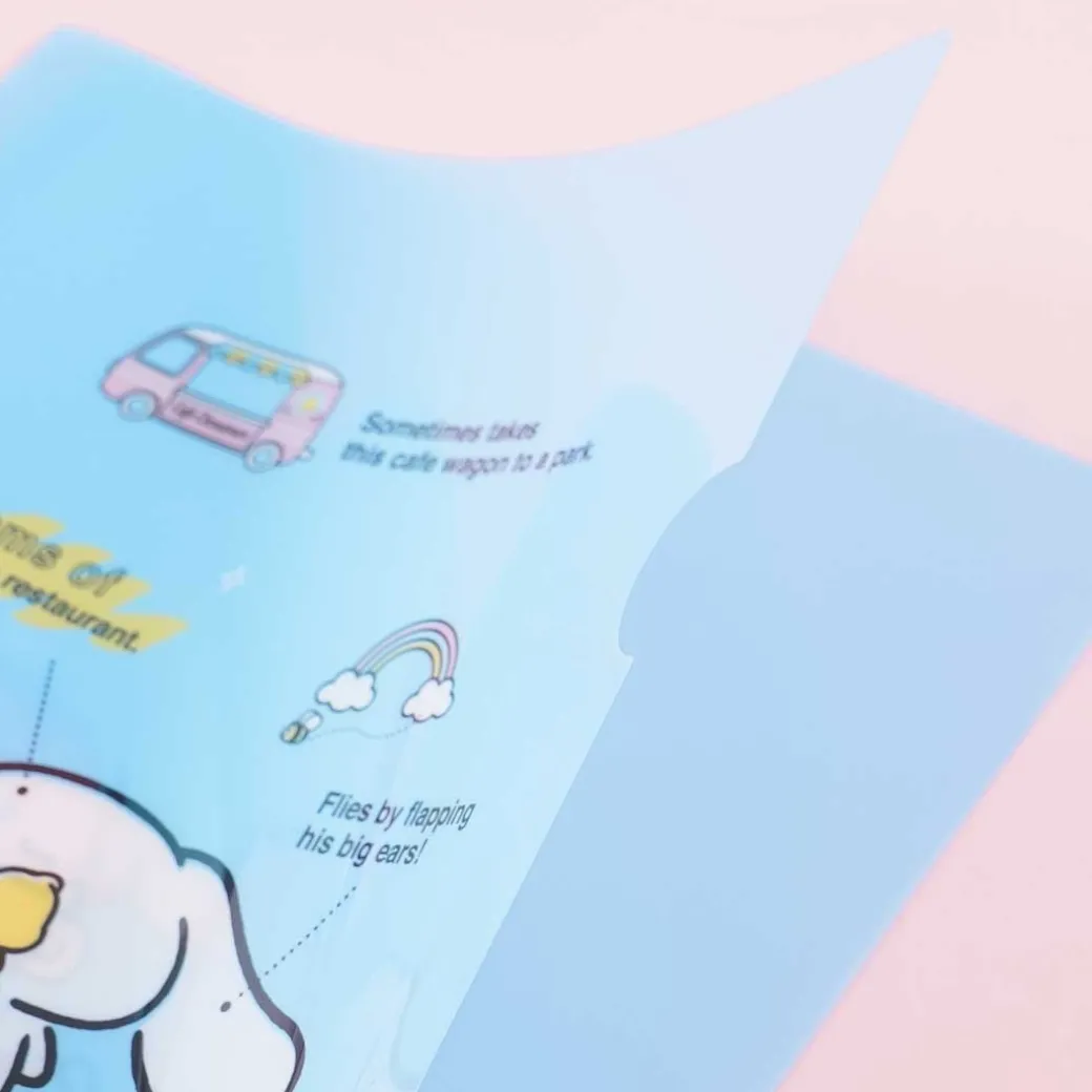 - A kawaii A4 folder featuring the back of Cinnamoroll and fun facts about him