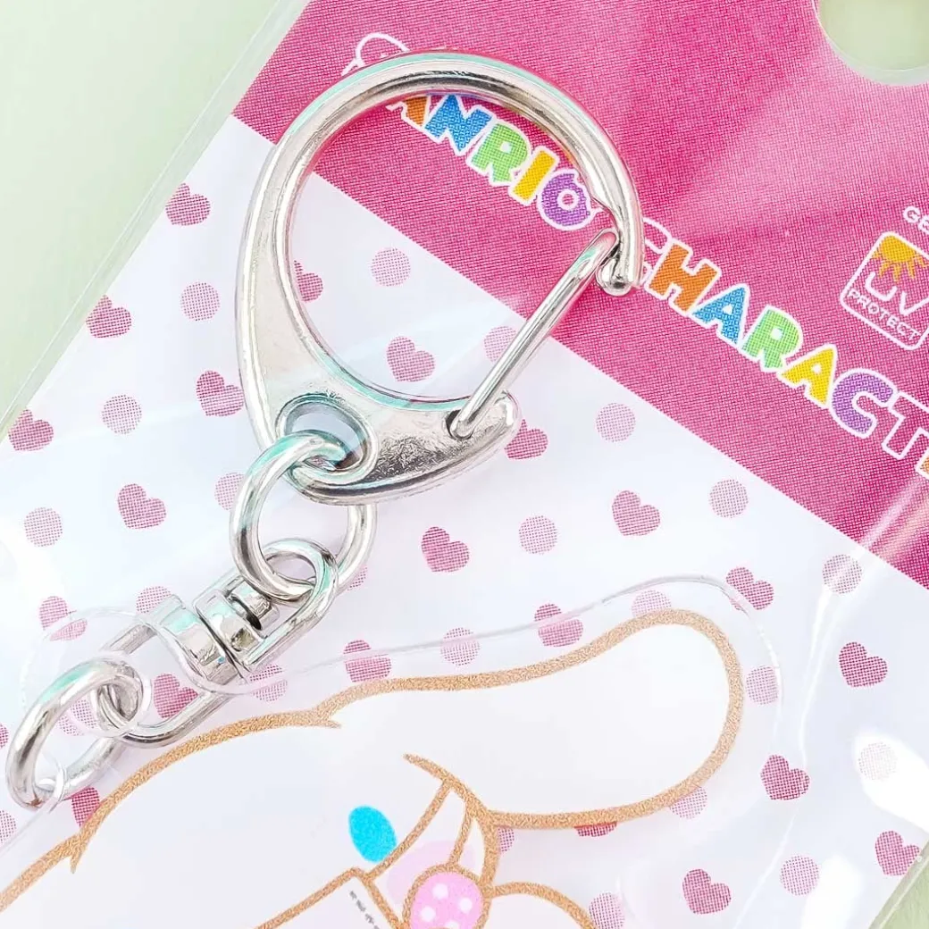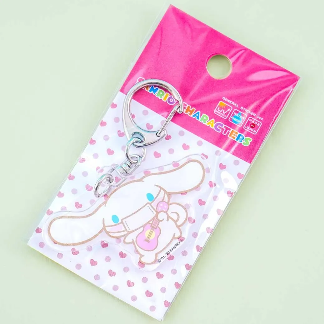 - A super kawaii acrylic charm illustrated with Cinnamoroll wearing a mask while carrying a guitar