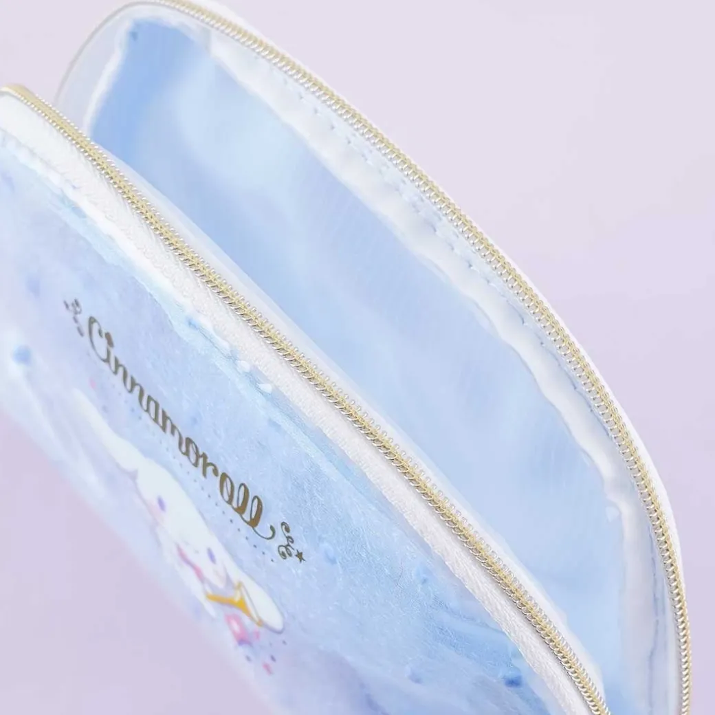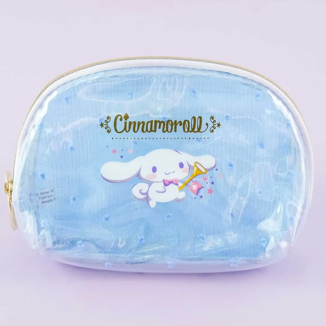 - A cute shell-shaped cosmetic bag with an illustration of Cinnamoroll and a trumpet