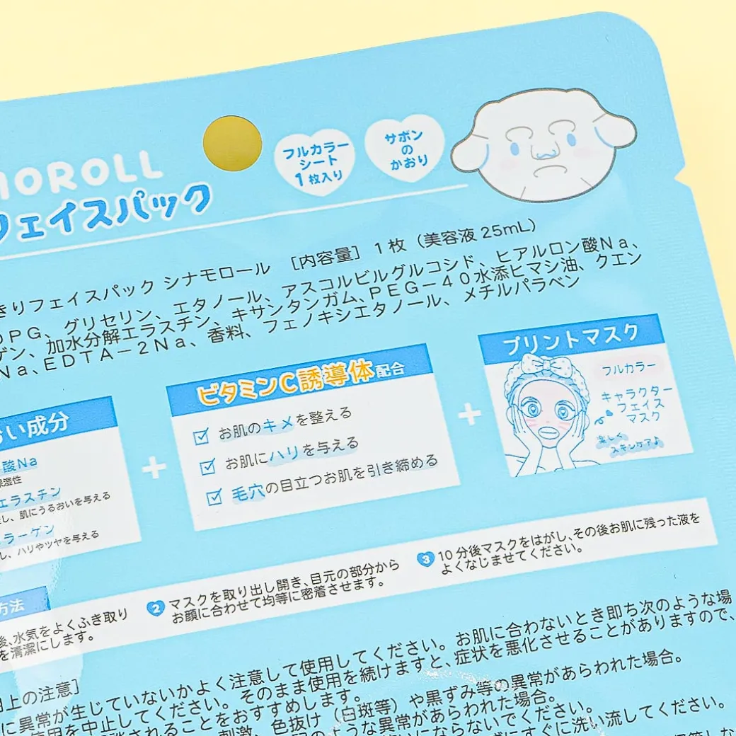 Keep your face soft and hydrated when you use this face mask that’s shaped like Cinnamoroll! It contains moisturizing ingredients and vitamin C that brightens your skin. Apply it to your face after washing!