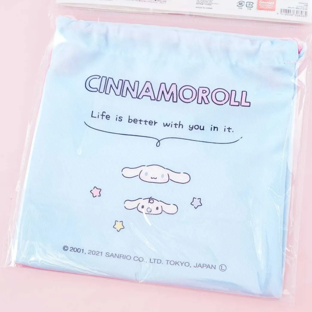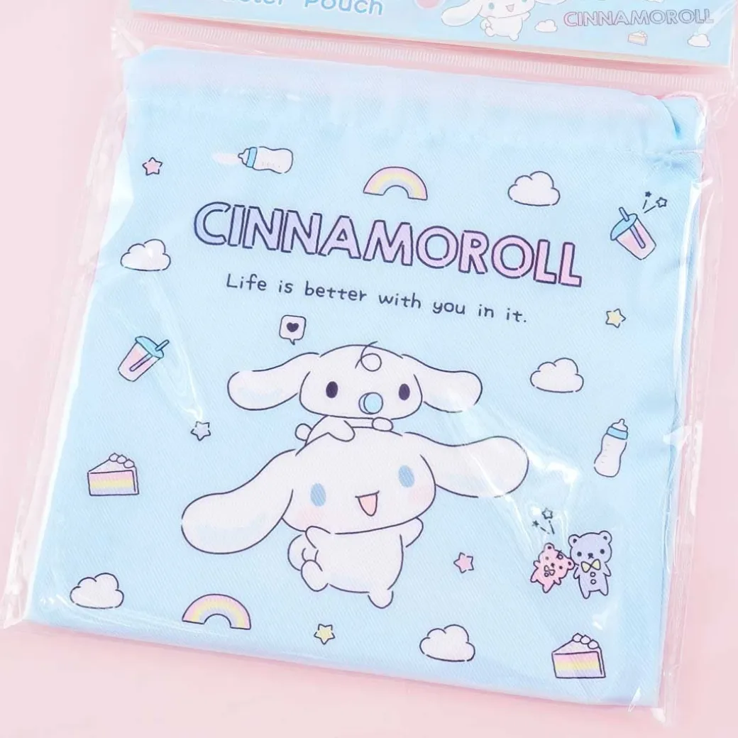 - A drawstring pouch featuring Cinnamoroll, Milk, clouds, and desserts