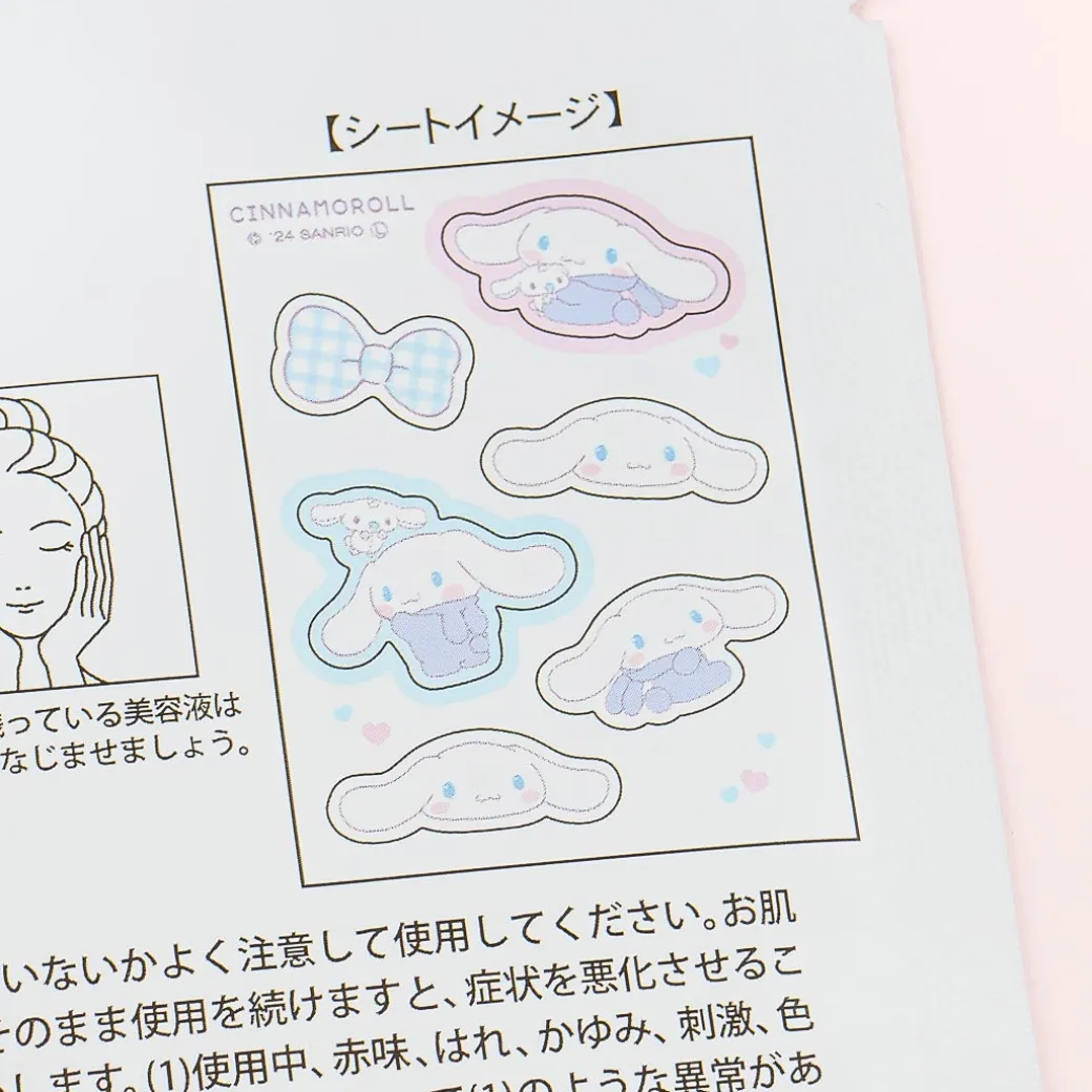 This sheet contains peach-scented point face masks with a unique set of die-cut designs featuring Cinnamoroll in a bunny suit with his bestie, Milk! Use these to keep your face smooth and supple. Its pastel blue packaging comes with a matching illustration as well.