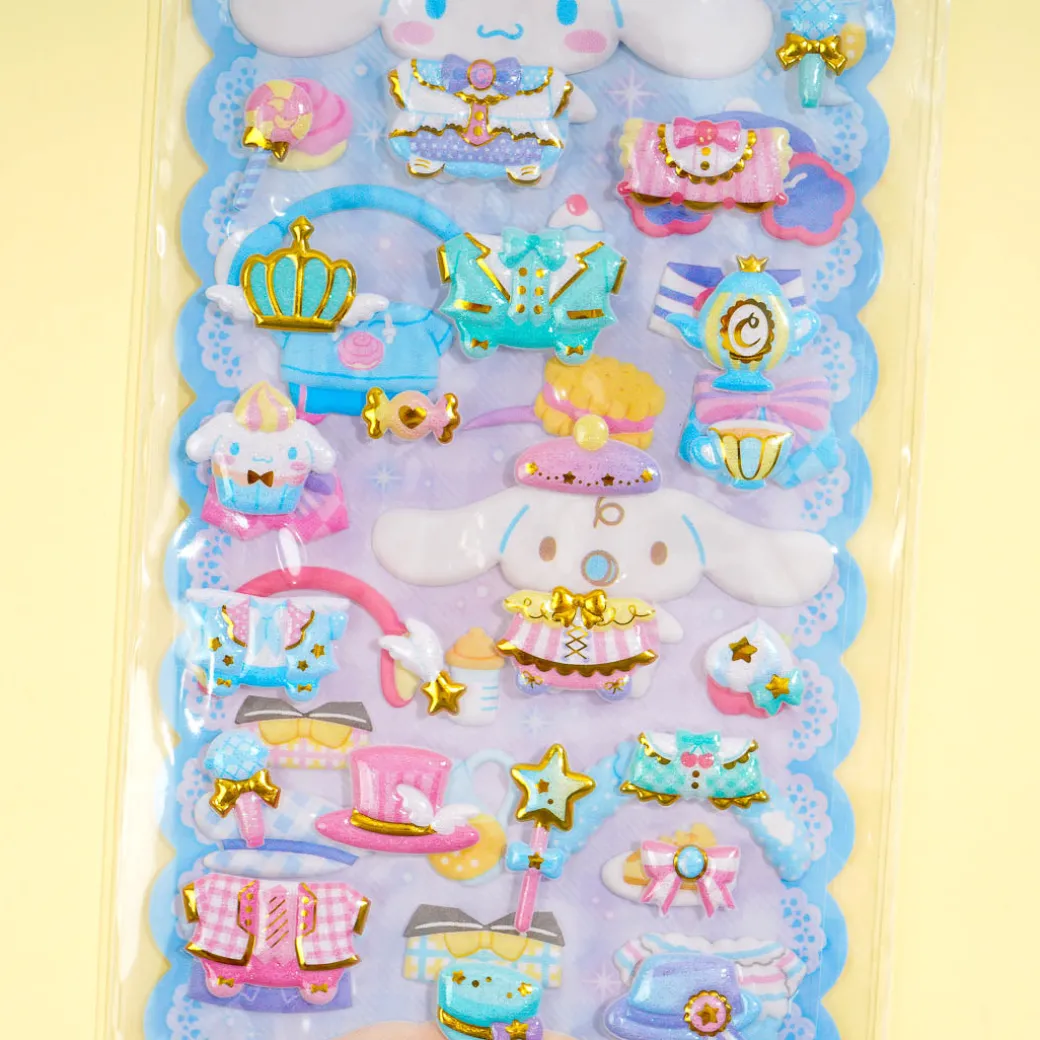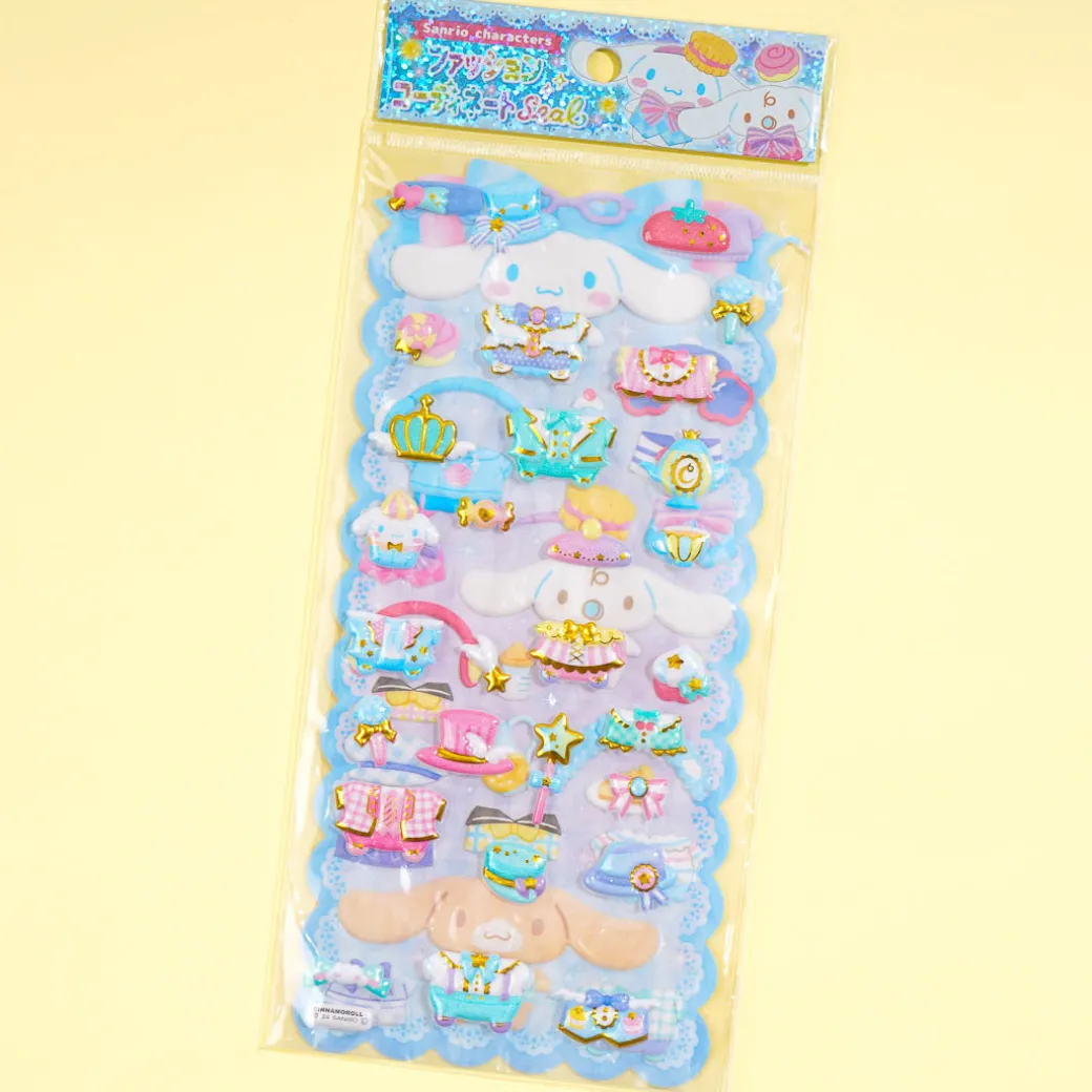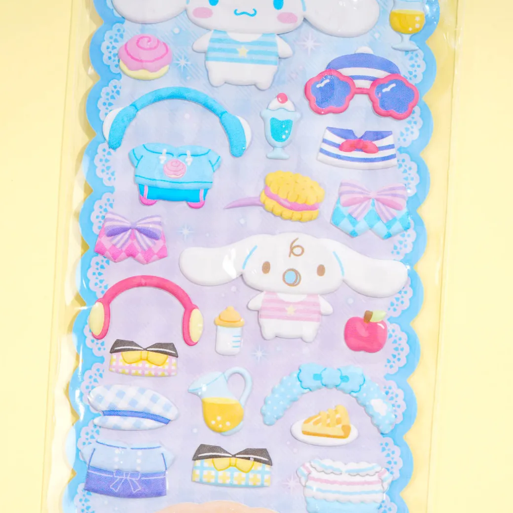 This two-layered sticker sheet lets you play dress up with Cinnamoroll and Milk! It comes with puffy stickers featuring glittery and gold-foiled outfits and accessories. You can mix and match the outfits however you like!