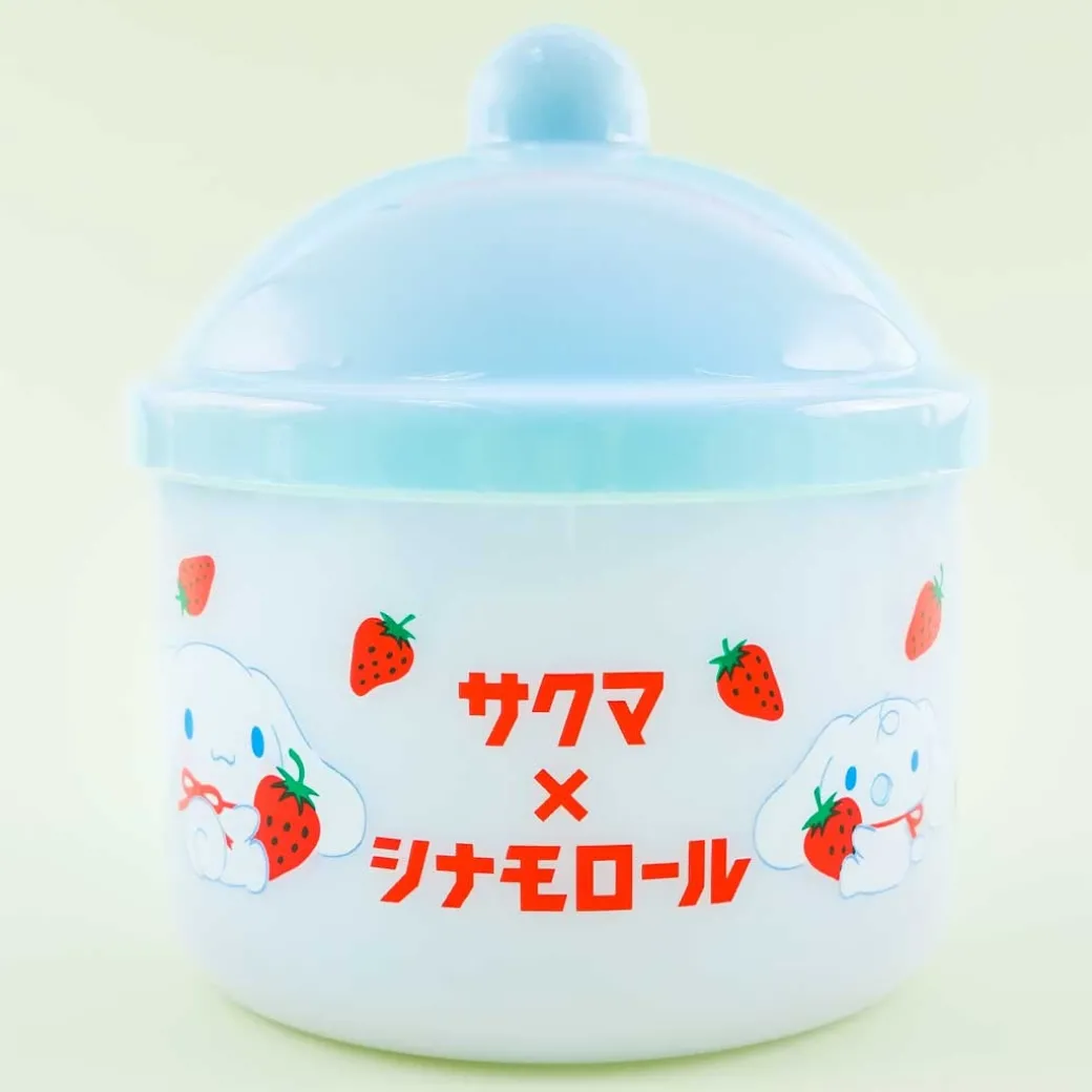 - A super cute mini reusable candy jar with prints of Cinnamoroll, Milk, and strawberries