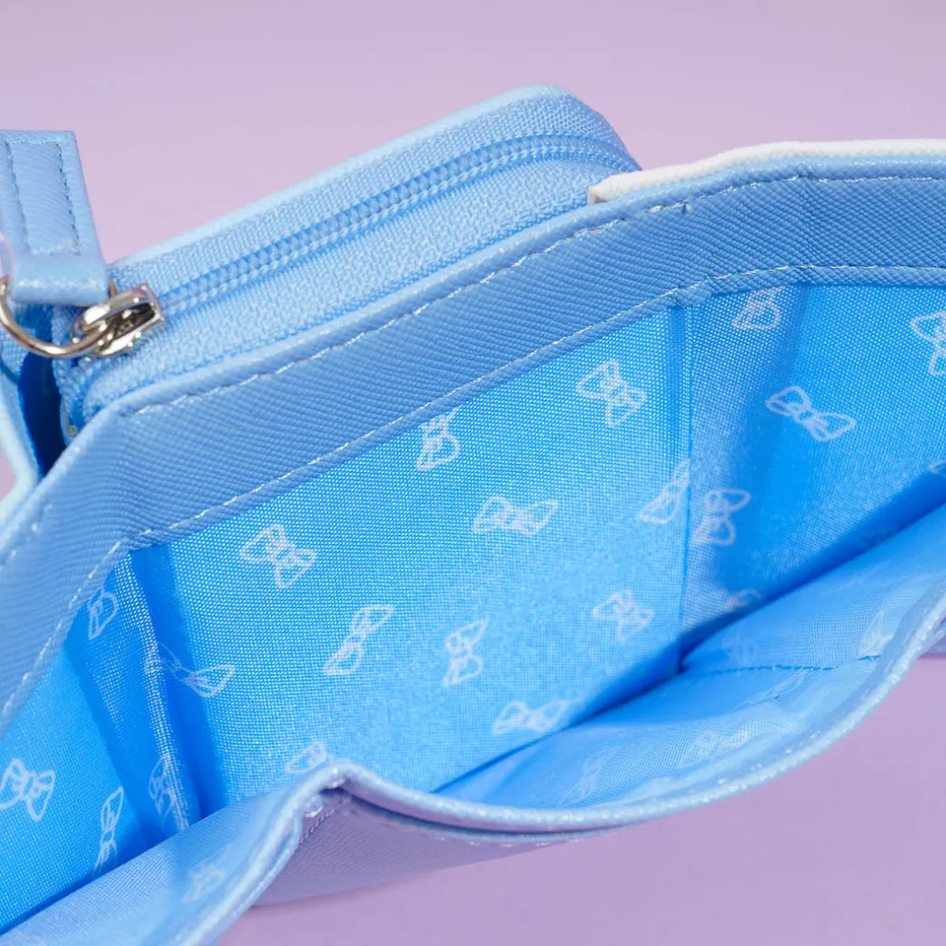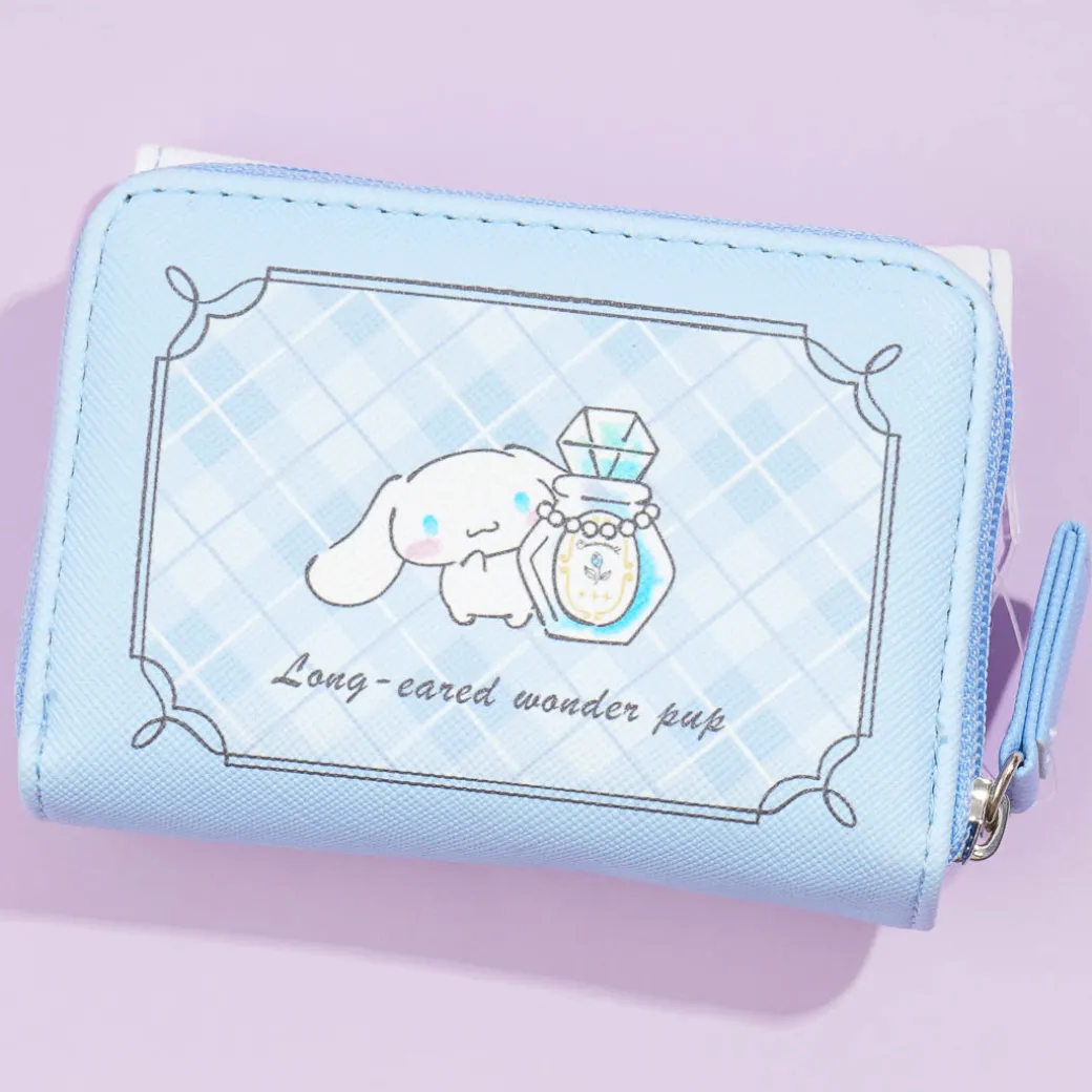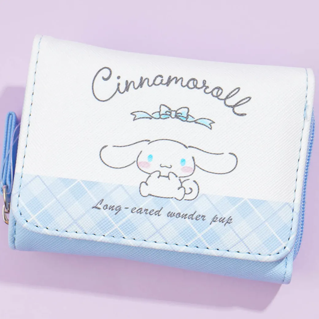 Take this mini sky-blue wallet with you when you’re out shopping! It features kawaii illustrations of Cinnamoroll and plaid pattern borders! The wallet comes with a convenient billfold that folds into three, multiple card slots, and a spacious coin purse.
