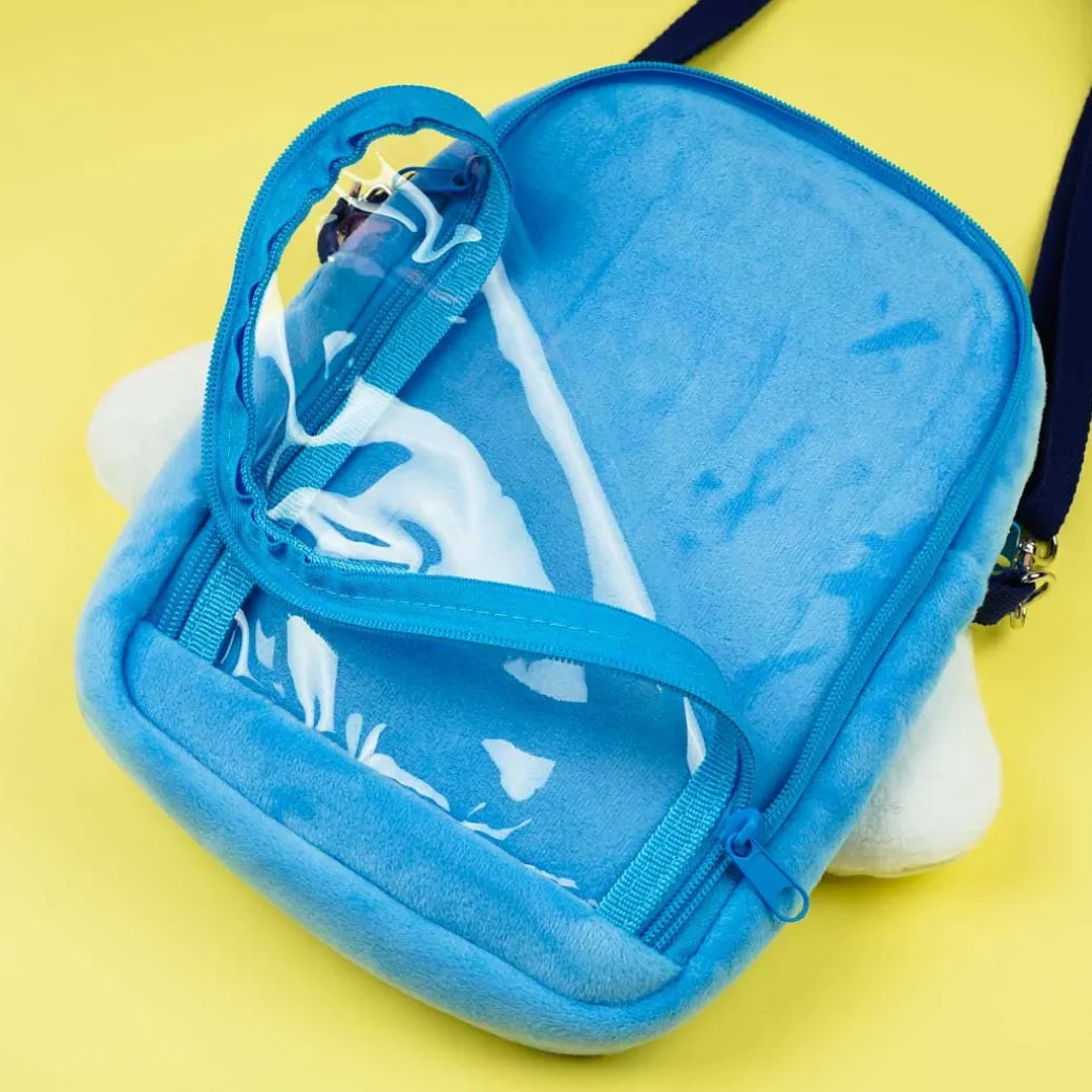 - A kawaii plushie shoulder bag decorated with a print of Cinnamoroll