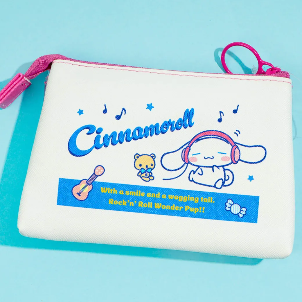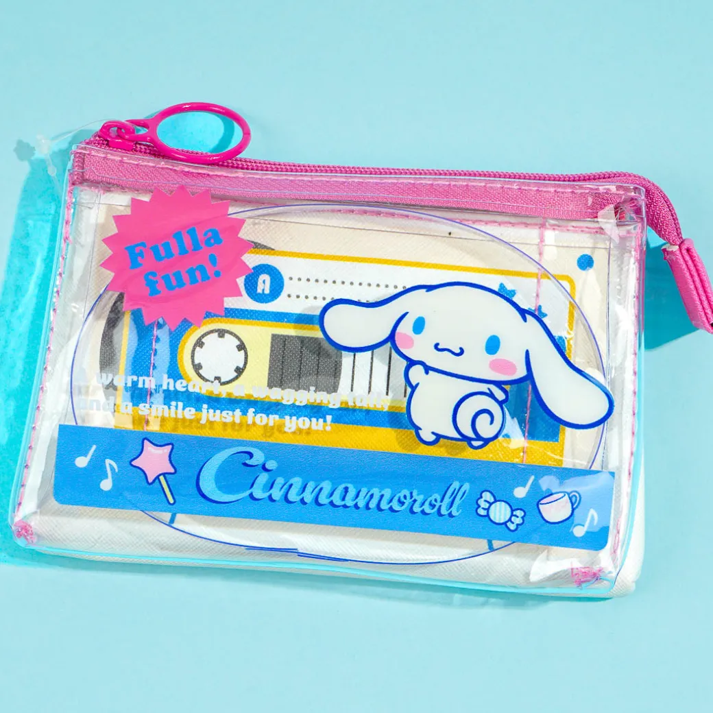 This super kawaii pouch showcases a kawaii clear retro cassette design with a print of Cinnamoroll! Use it to store your hair ties, lipstick, and other small beauty items. This zippered pouch has multiple compartments you can use.
