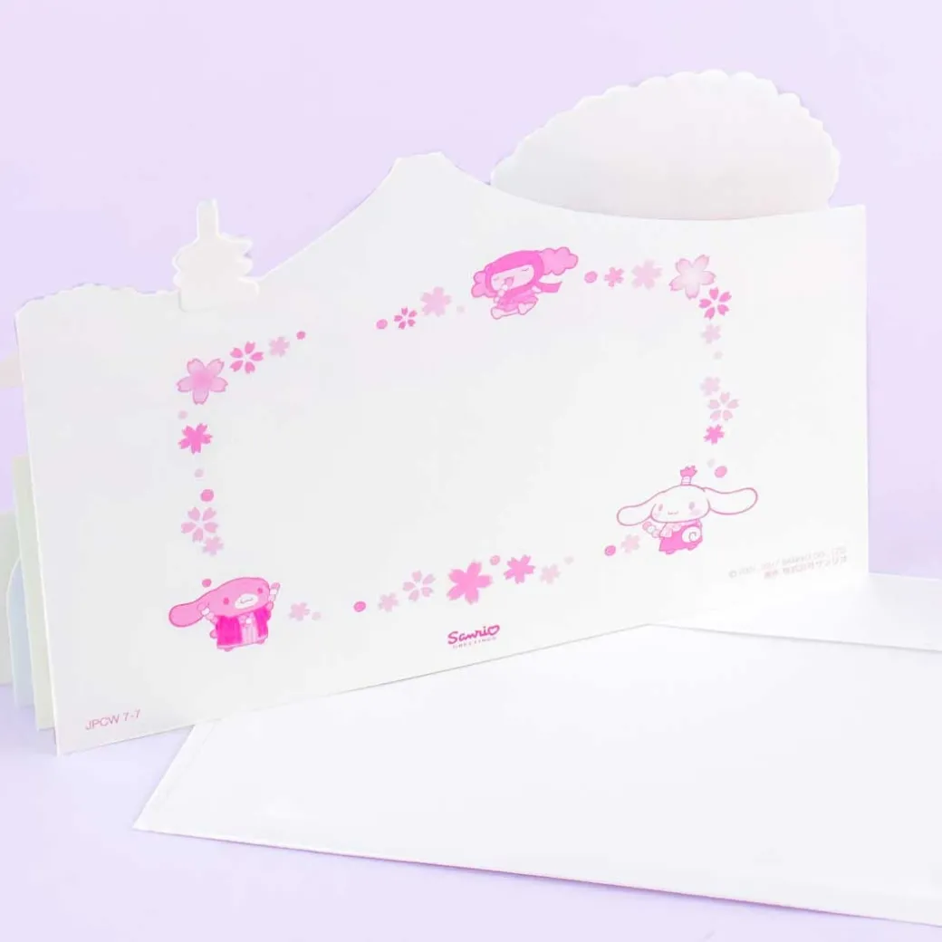 - A super cute 3D greeting card featuring Cinnamoroll characters eating dango while viewing sakura blossoms