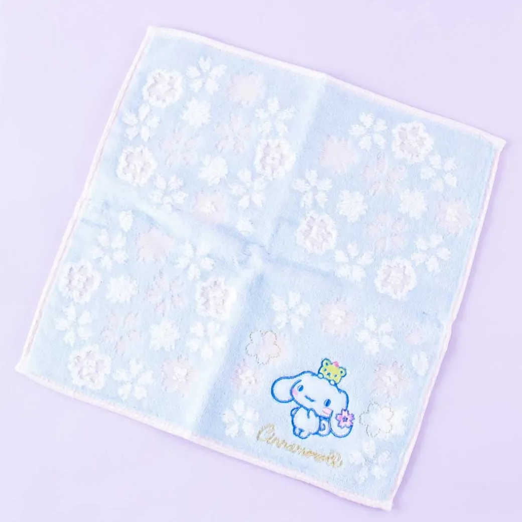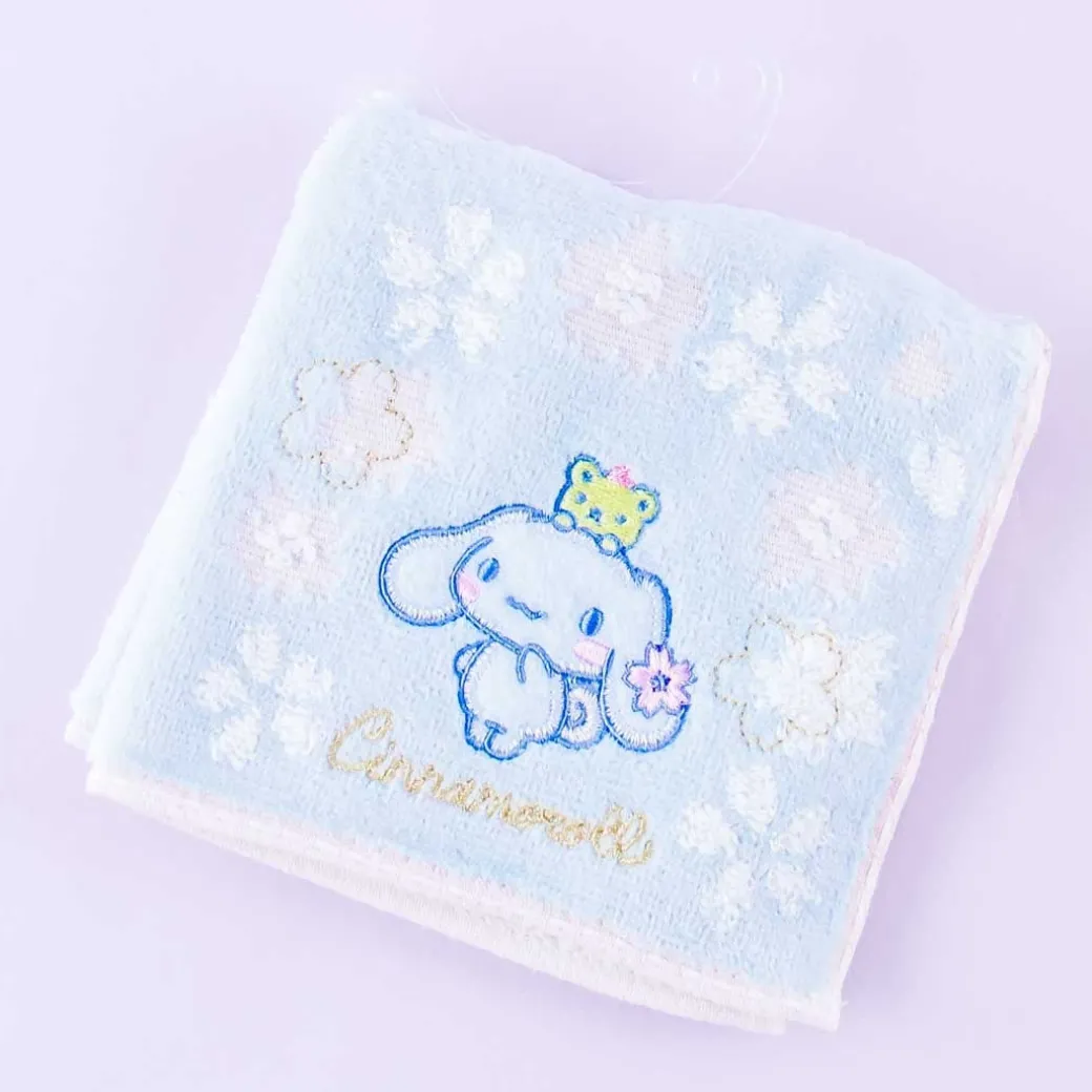 - A hand towel with embroidery featuring Cinnamoroll and sakura flowers