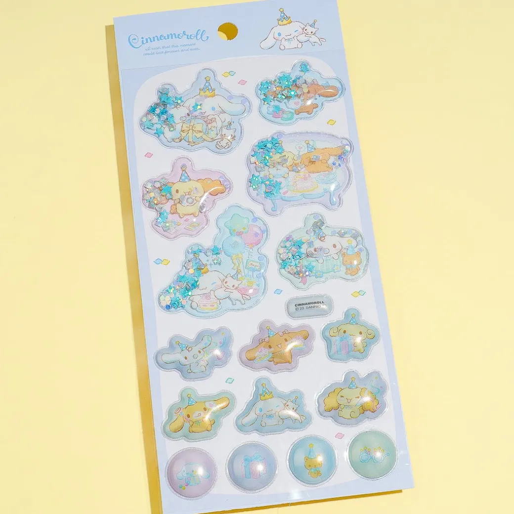 Spend the afternoon jazzing up your journal cover with this sheet of shaker stickers. It showcases Cinnamoroll and his buddies hanging out! Some of these liquid-filled stickers have glitter inside them.