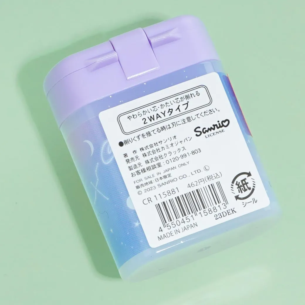 This kawaii sharpener features a design of Cinnamoroll and Milk underneath a starry night sky! It has dual holes so you can sharpen various types of pencils.