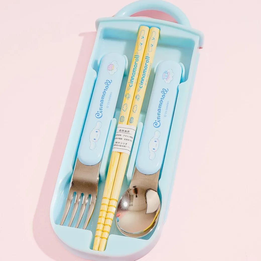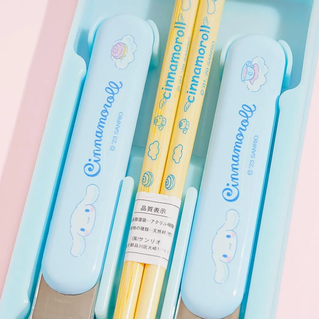 This kawaii utensil set features cute prints of Cinnamoroll having a tea party! It includes a spoon and fork with antibacterial properties, a pair of reusable bamboo chopsticks, and a name sticker. They come in a cute carrying case with a sliding transparent cover.