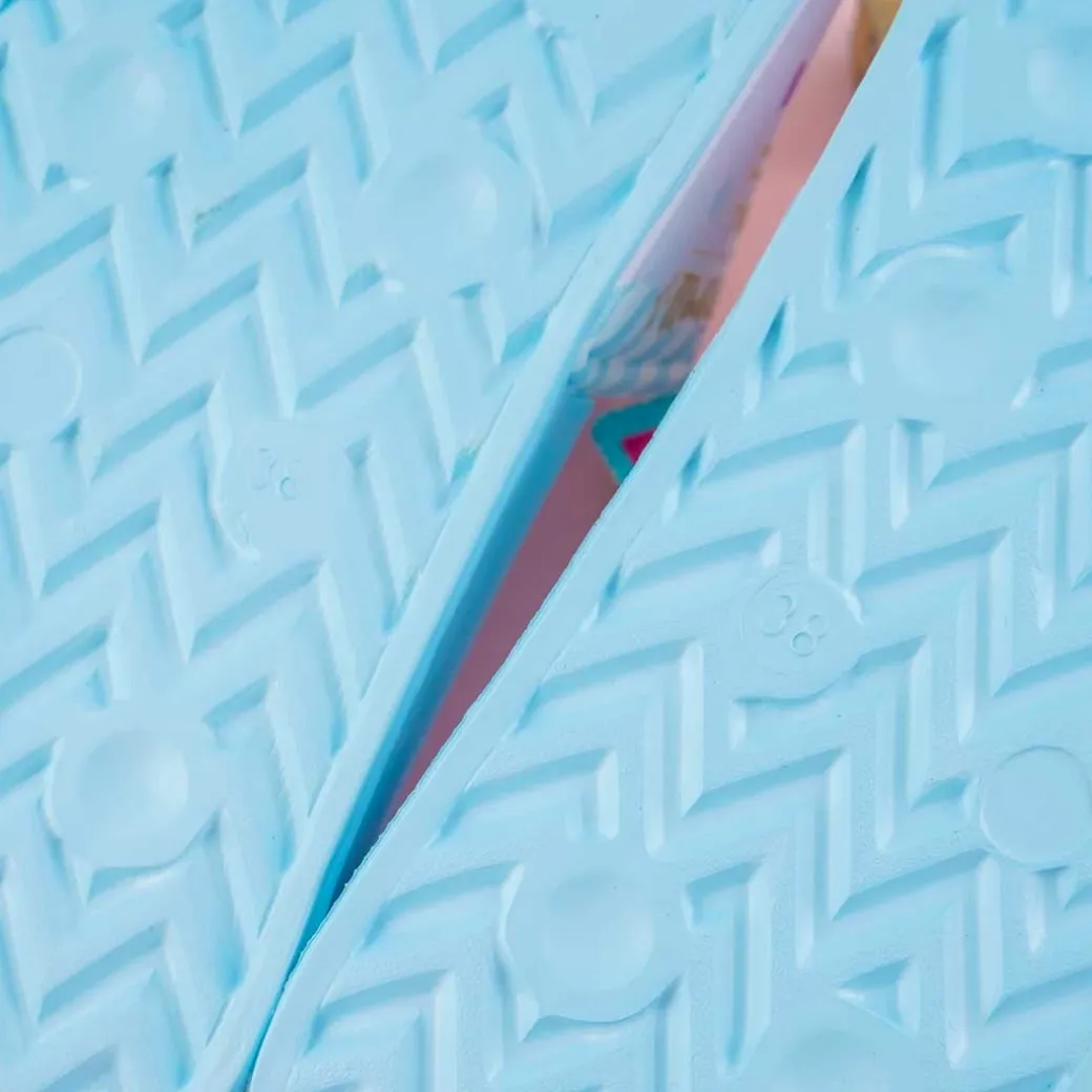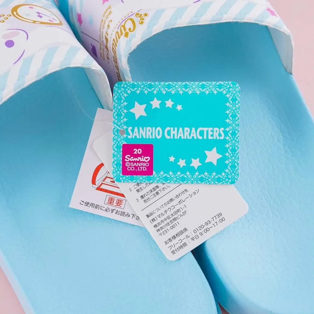 - A kawaii pair of large blue slippers with illustrations of Cinnamoroll and a pocket watch