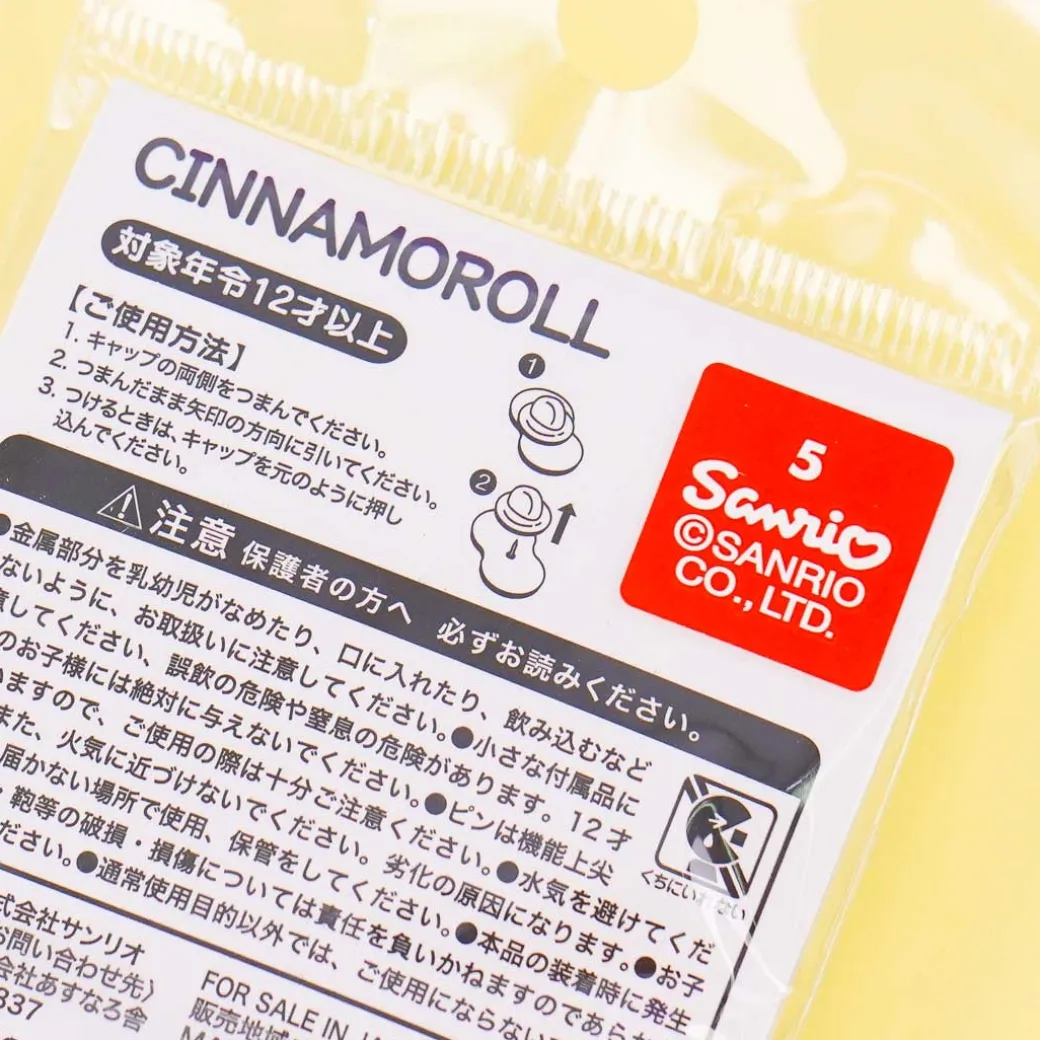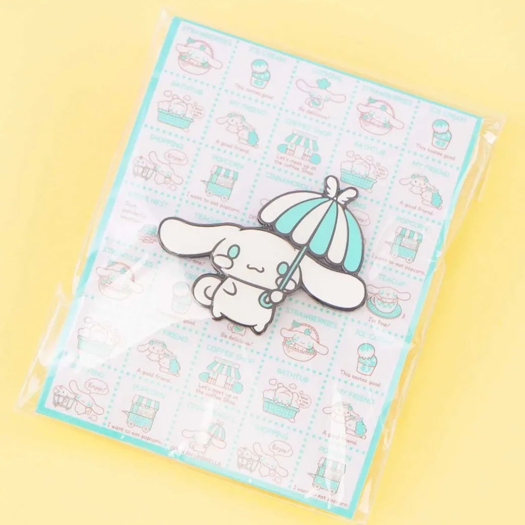 - A super kawaii pin decorated with a print of Cinnamoroll holding an umbrella