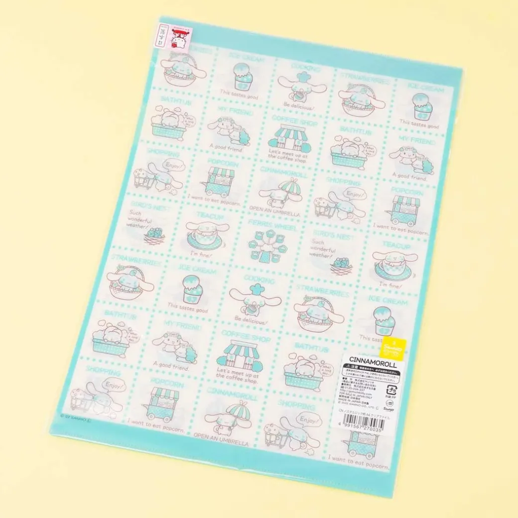- A cute A4 folder decorated in prints of Cinnamoroll doing all sorts of things