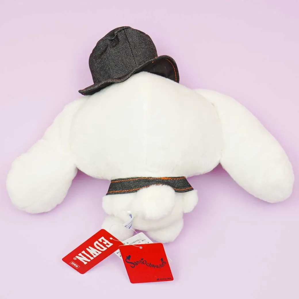 - A kawaii medium-sized Cinnamoroll plushie in a black denim cloak and hat