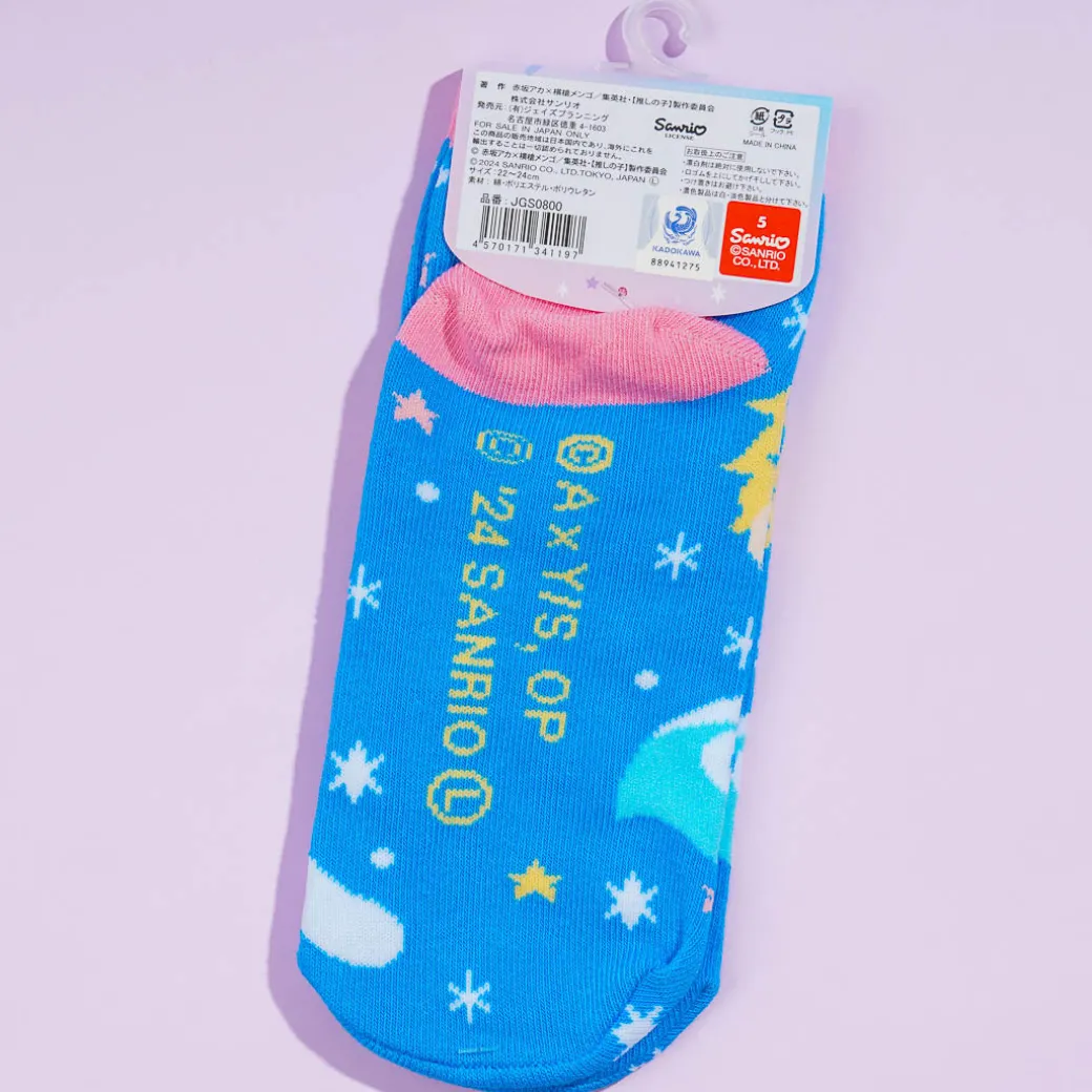 Keep your feet cute and comfy by wearing this super kawaii pair of socks! It features an illustration of Cinnamoroll and Aquamarine Hoshino from the anime Oshi no Ko. It’s made of cotton and polyester fabric that are gentle on the skin!