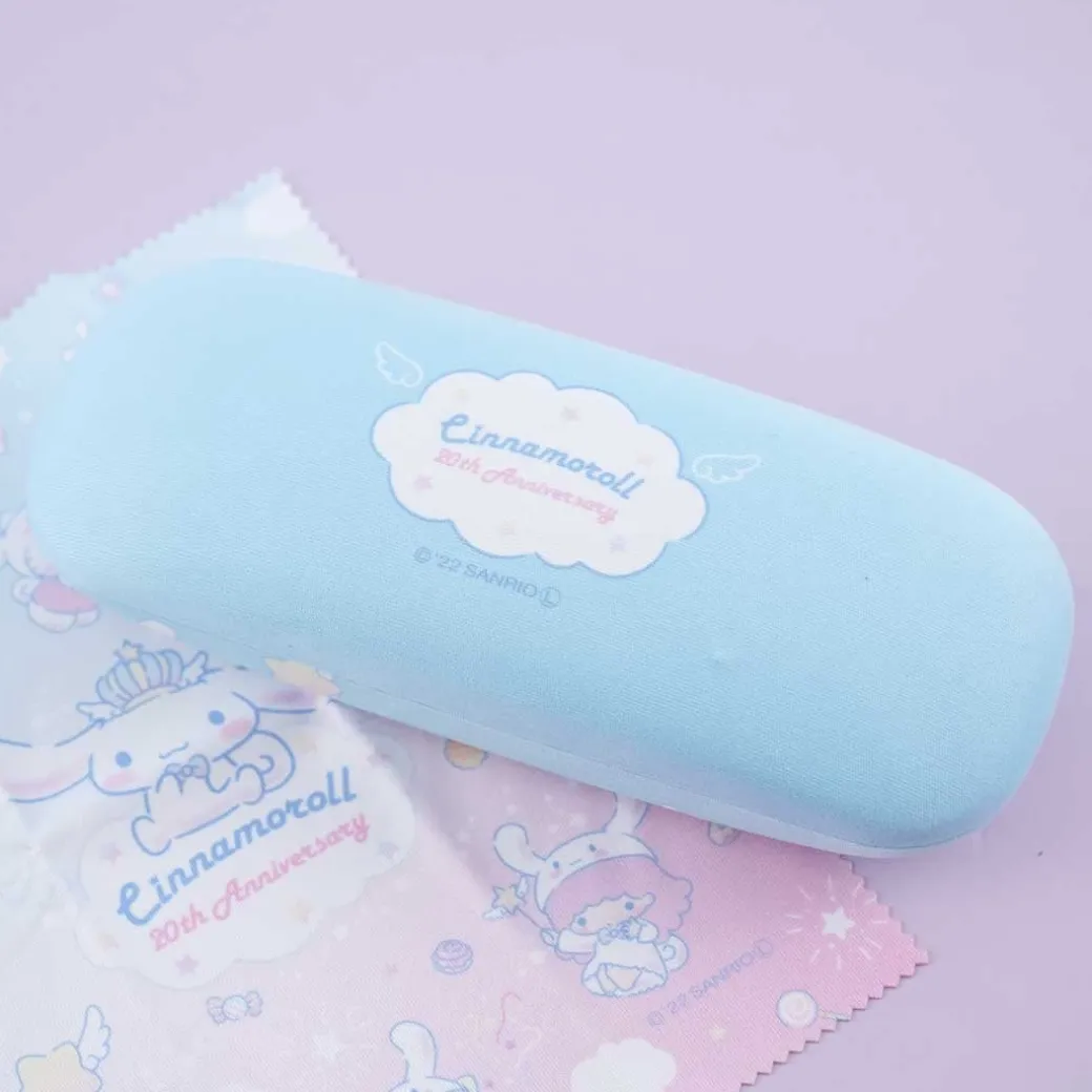 - A super cute blue eyeglass hard case with illustrations of Cinamoroll and Sanrio Characters in Cinnamoroll onesies